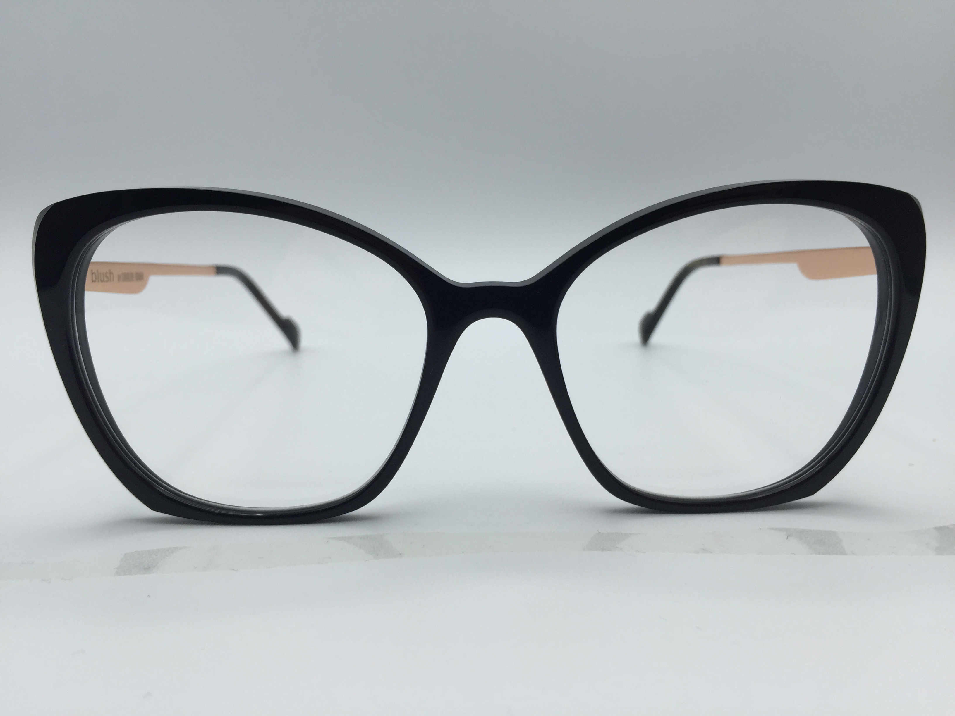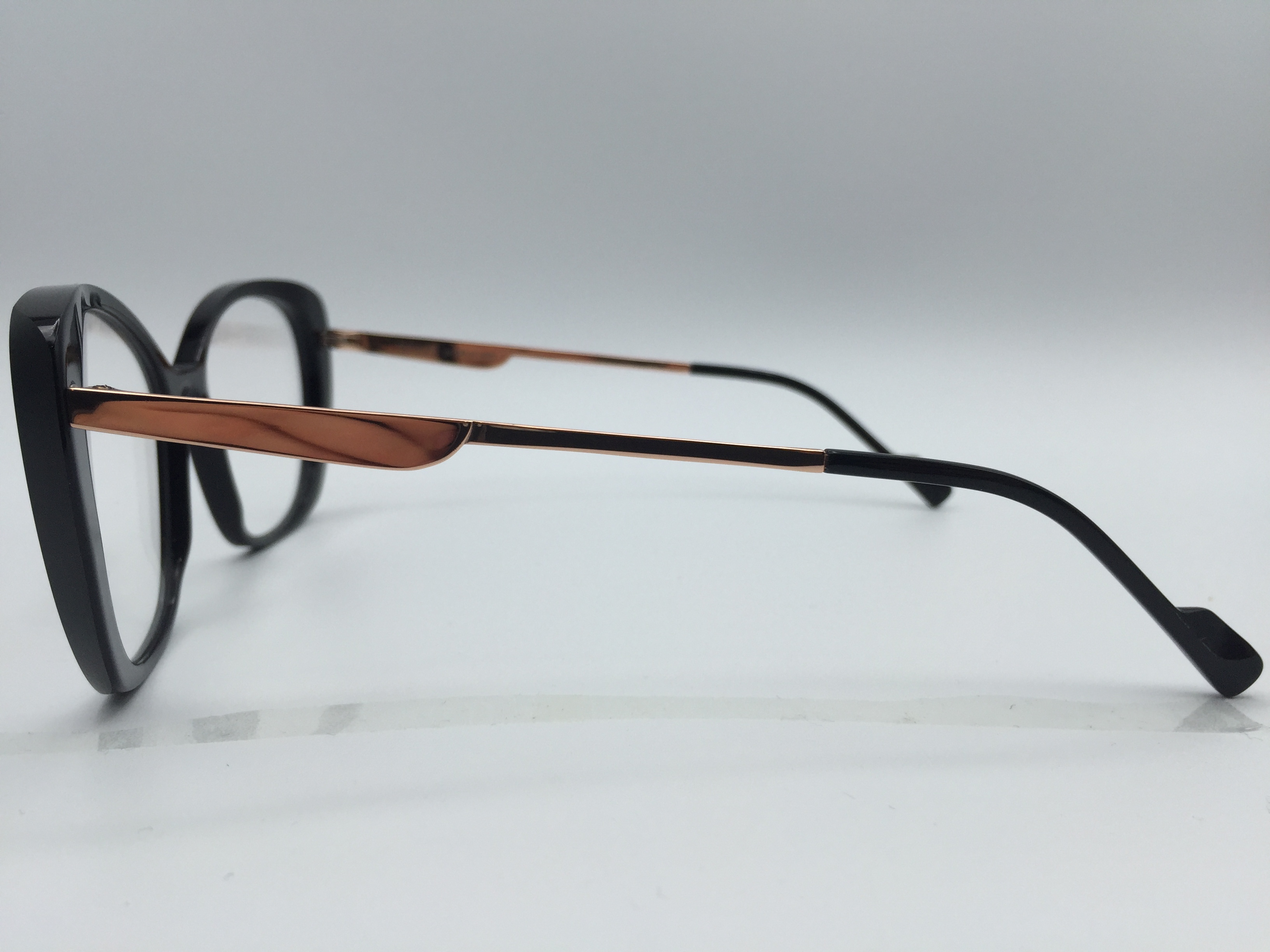 Schwarze acetate Fassung mit rosegoldenen Metallbügeln. Die Fassung ist in Schmetterlingsform.