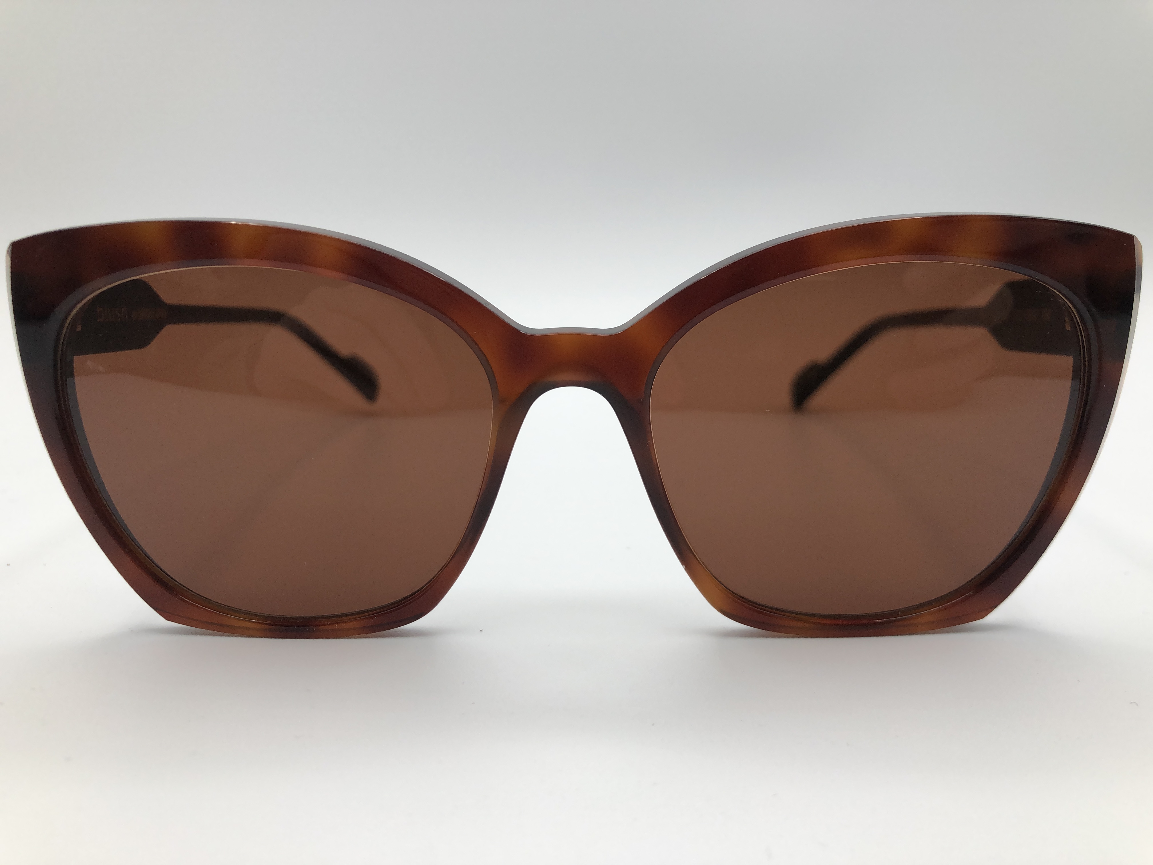Kunststofffassung in Schmetterlingsform in einem Havana braun mit schwarzen Bügeln. Die Gläser sind in einem passenden Barun.