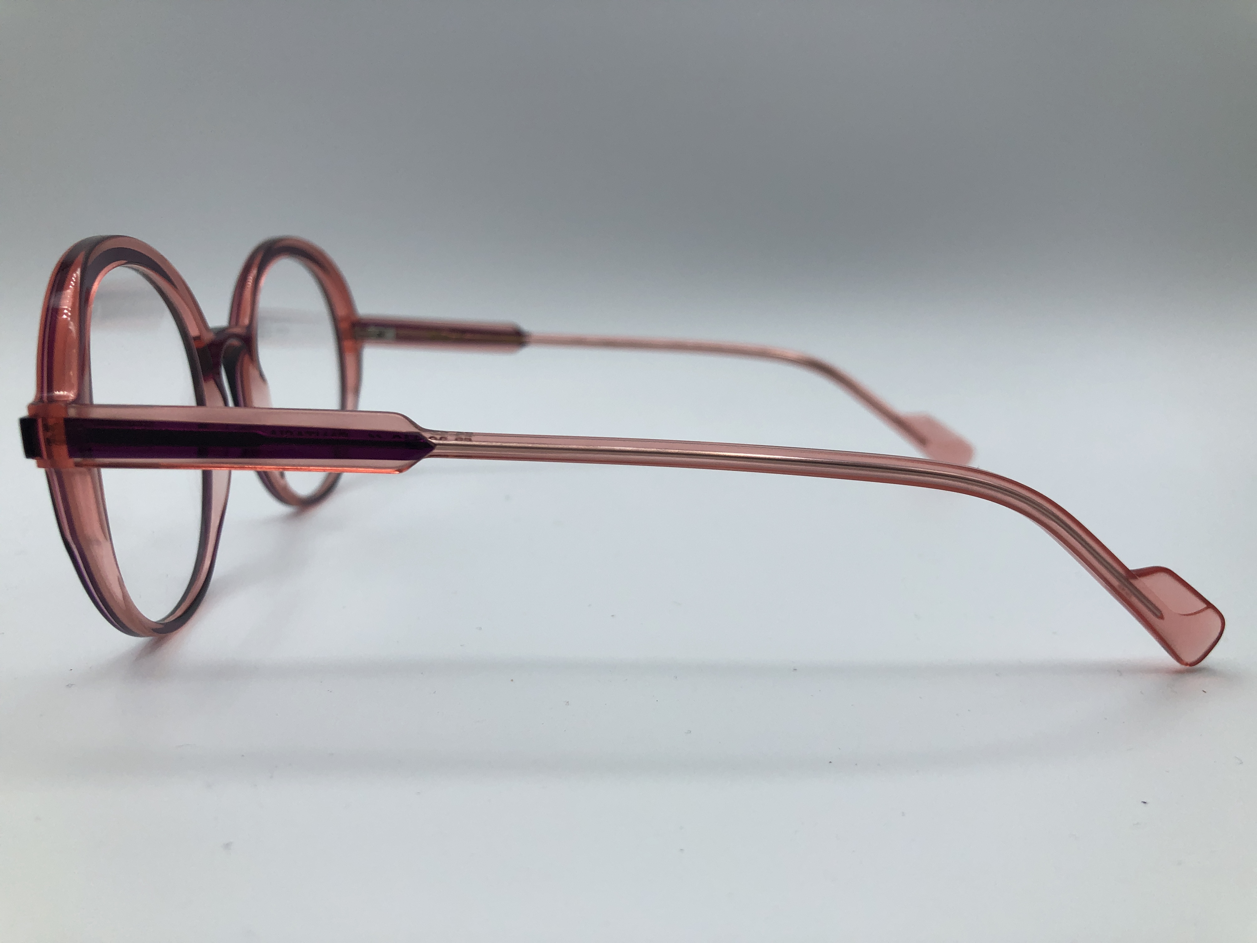 Modische Fassung in einem Lila und leichttransperenten Korall. Der Bügel ist zweifarbig in Lila und Korall. Hergestellt aus hochwertigem Acetat.