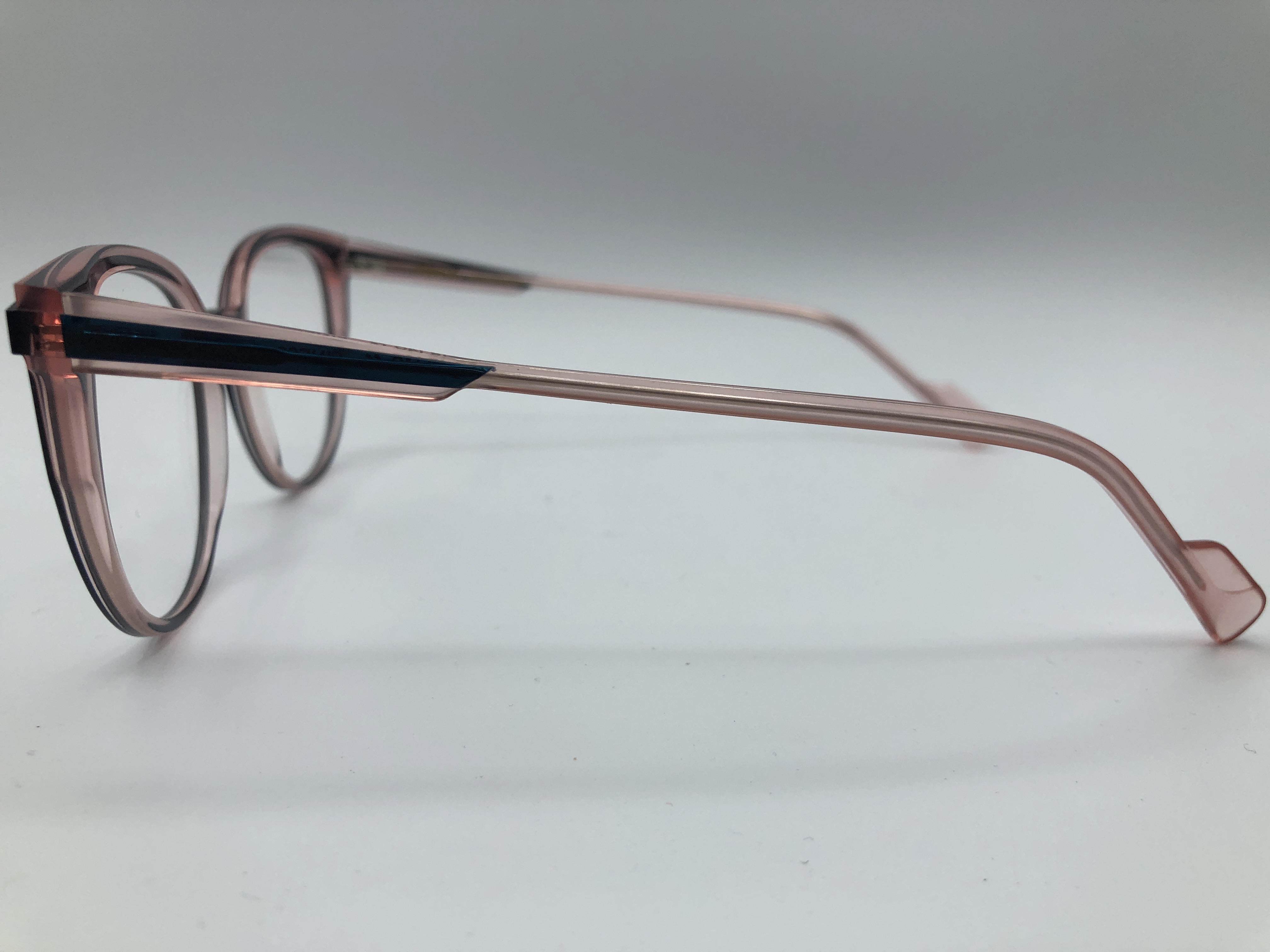 Modische Fassung in Dunkelblau mit hellrosa und einem zweifabigen Bügel. Hergestellt aus hochwertigem Acetat.