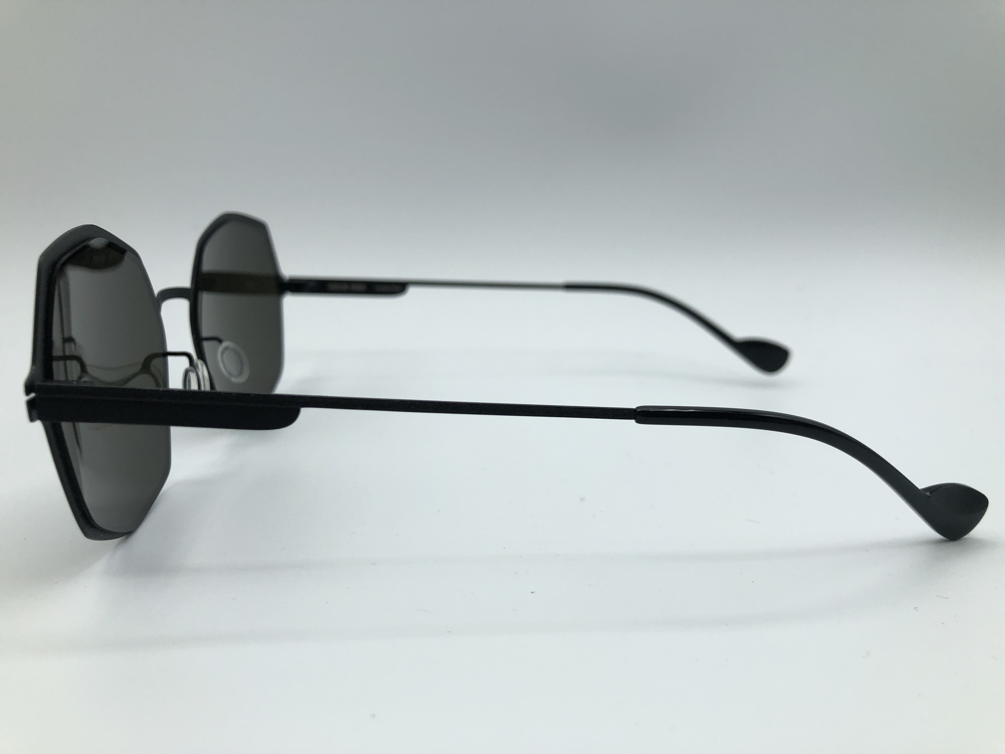 Achteckige Metallfassung von Caroline Abram in schwarz und oben mit einem leichten Muster abgesetzt. Die Gläser sind grün getönt