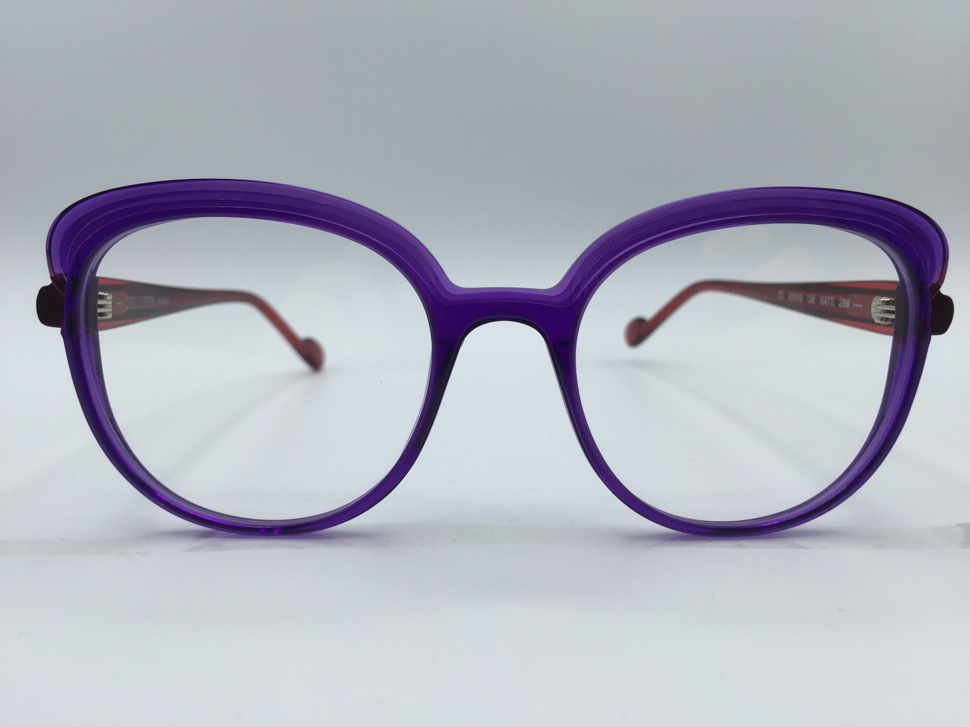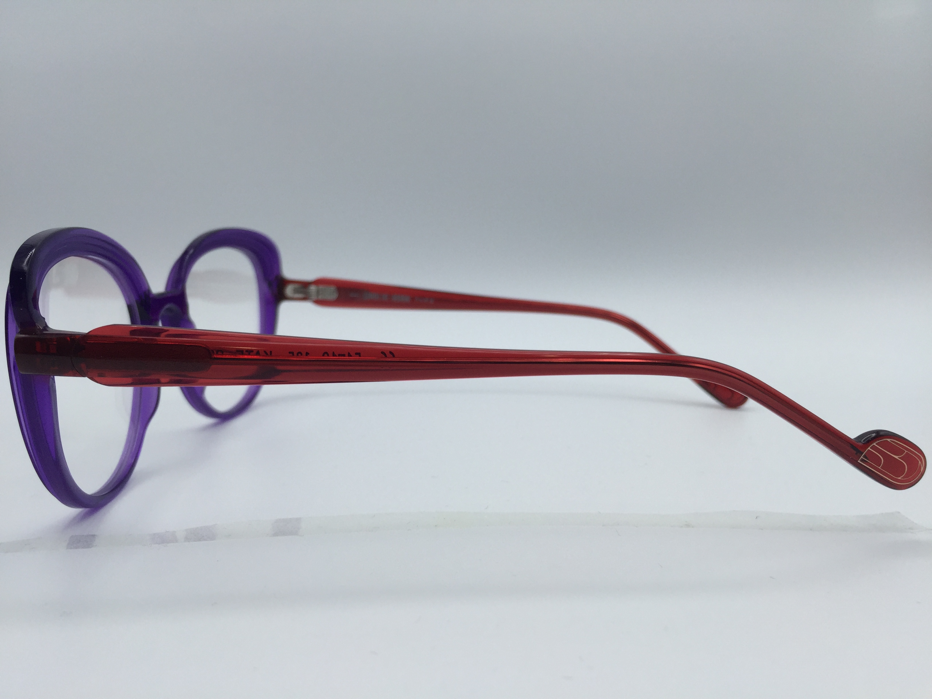 Cateye Acetate Fassung in lila mit roten Bügeln.