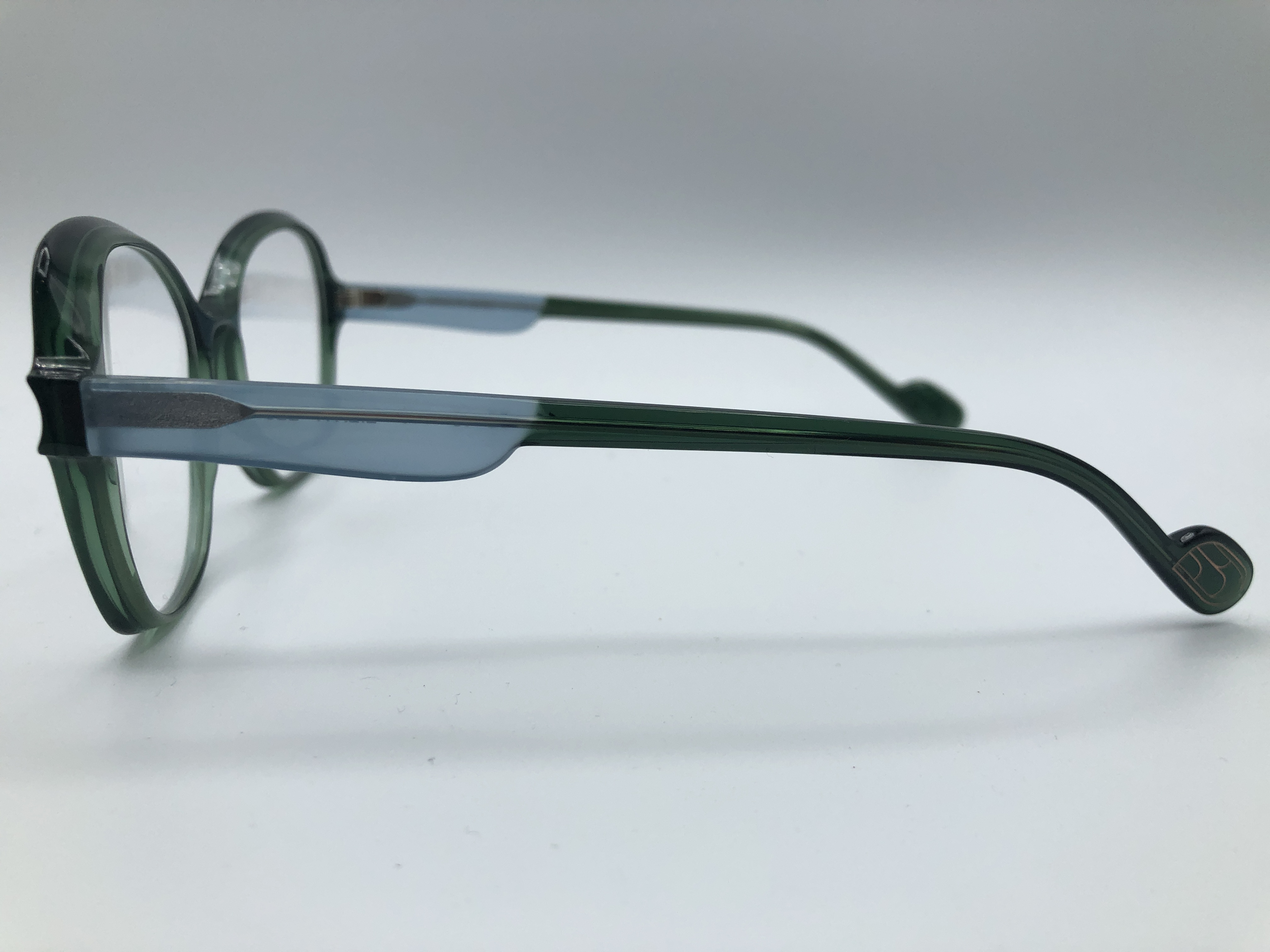 Modische Fassung in transperenten Dunkelgrün. Der Bügel ist zweifarbig aus Hellbalu und Grün. Hergestellt aus hochwertigem Acetate.