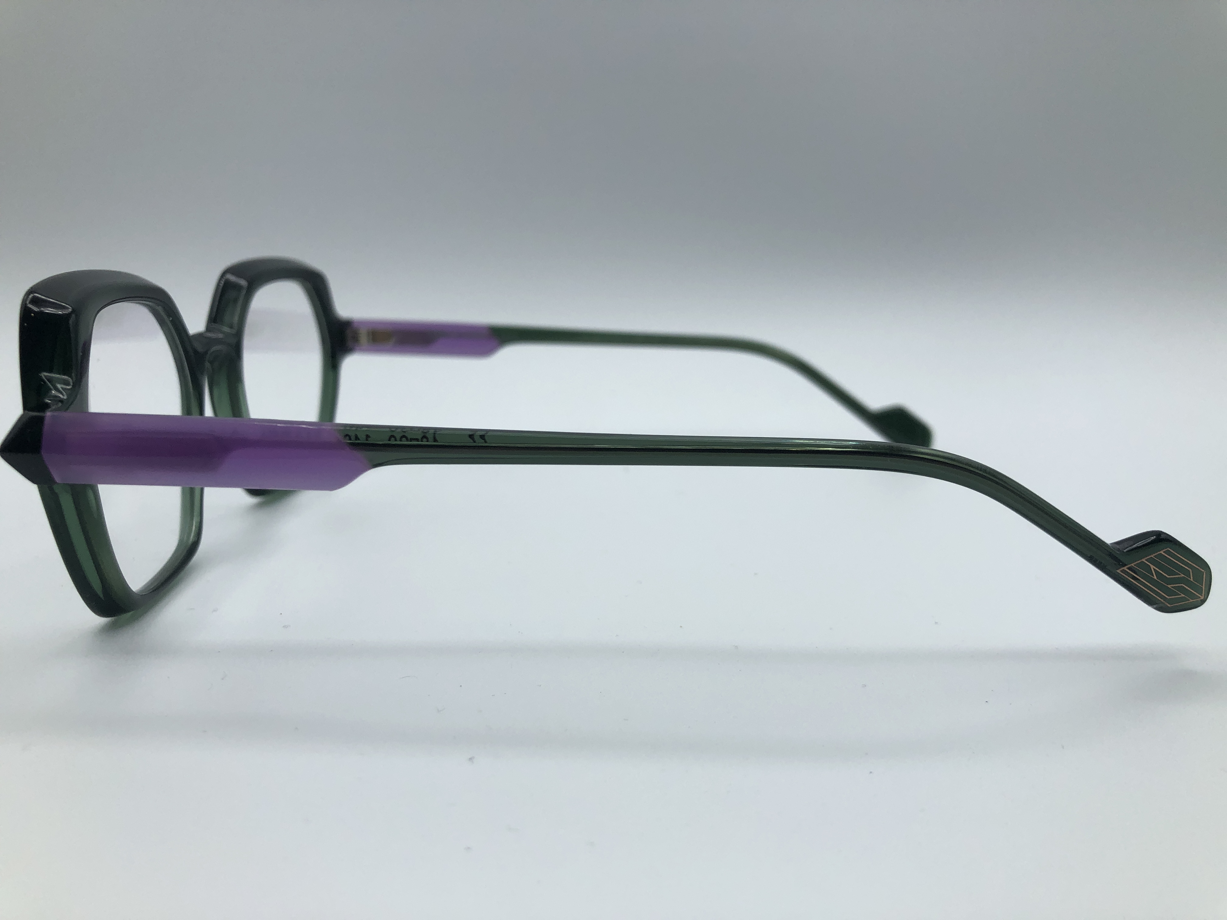 Modische Fassung in Dunkelgrün. Der Bügel ist zweifarbig in einem fliederlila und Dunkelgrün. Hergestellt aus hochwertigem Acetate.