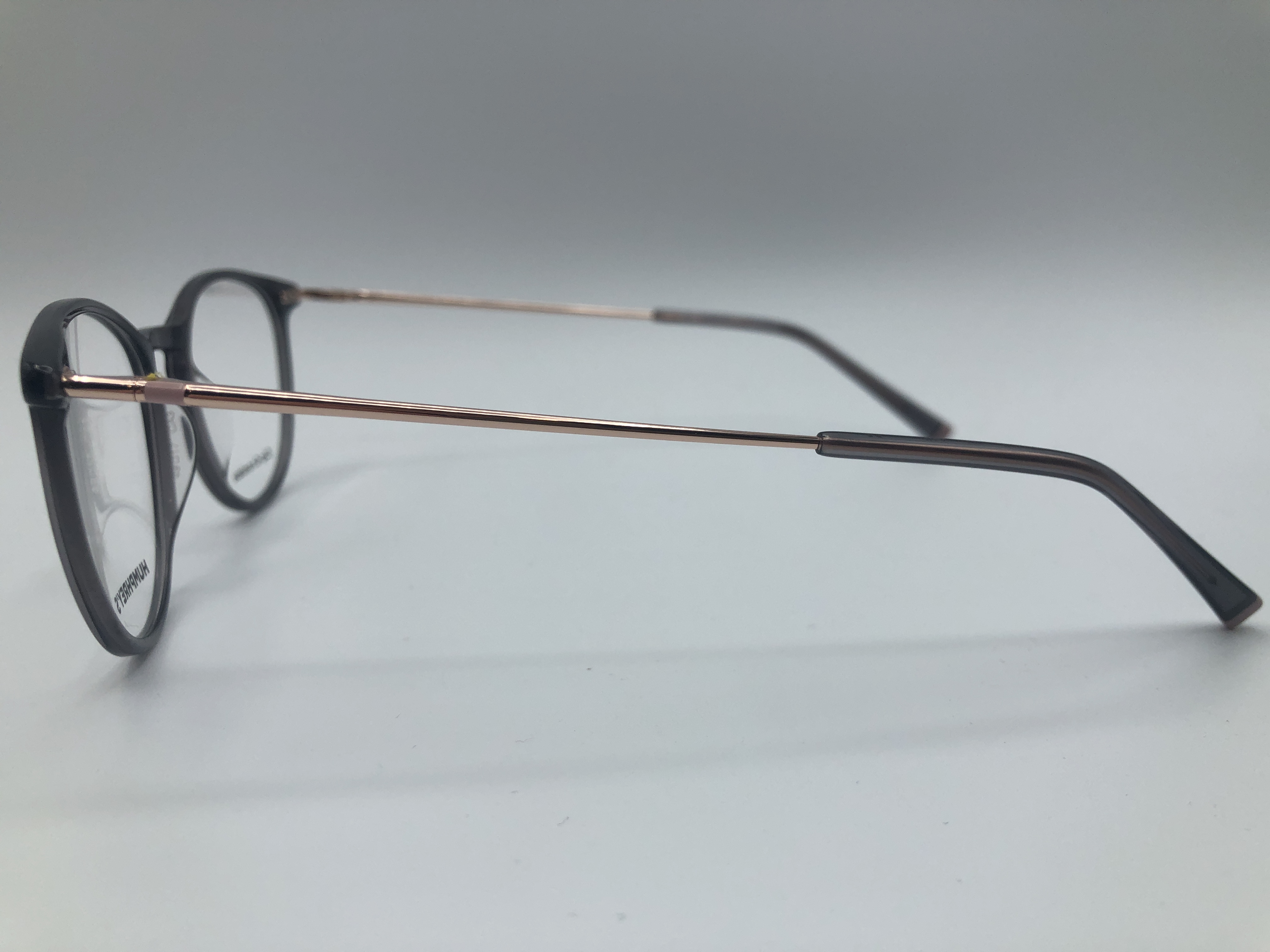 Diese Fassung in transparentem Grau überzeugt mit eleganten rosegoldenen Bügeln.
