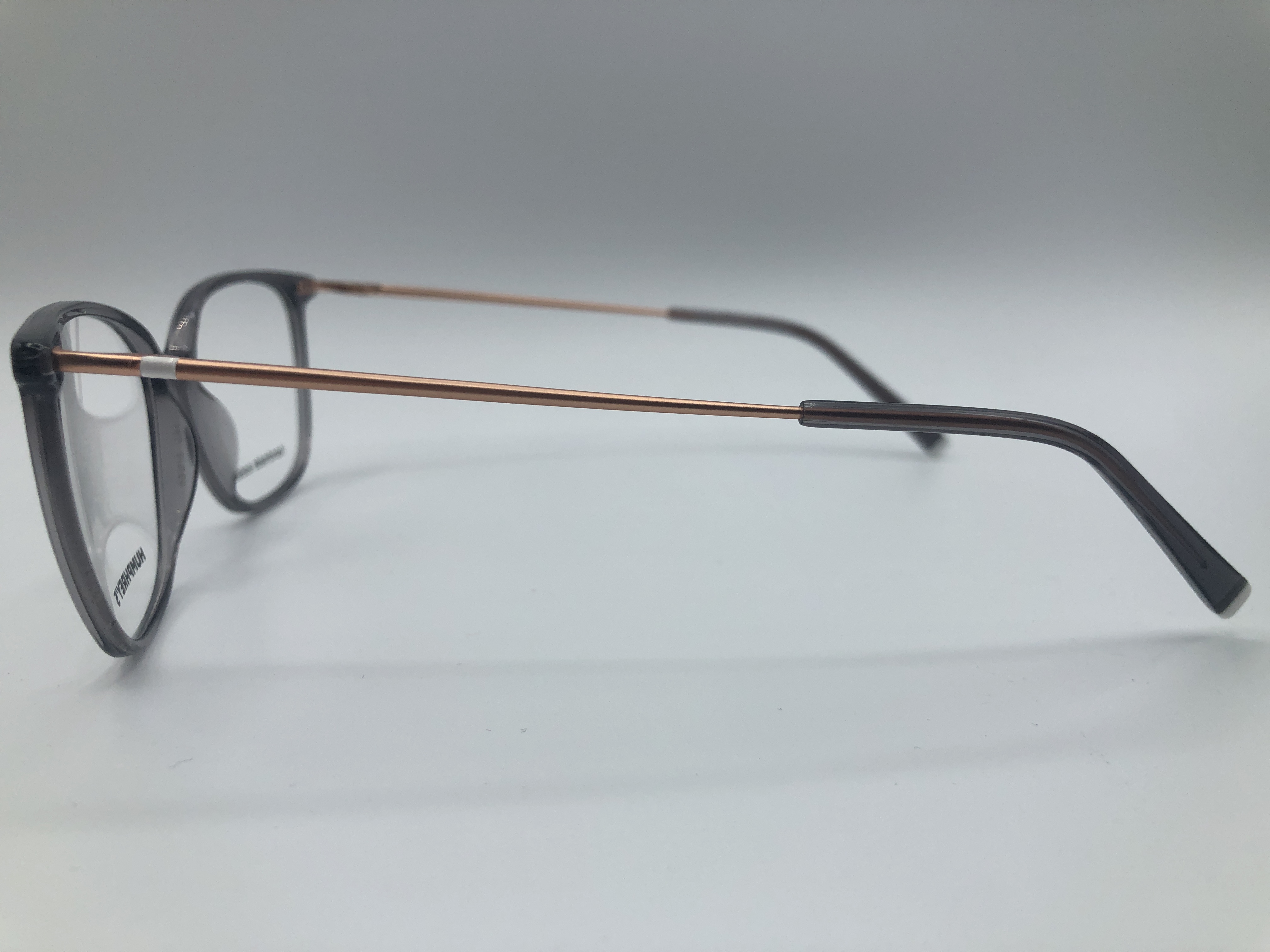 Diese Fassung in einem transparentem Grau überzeugt mit passenden, eleganten rosegolden Bügeln.