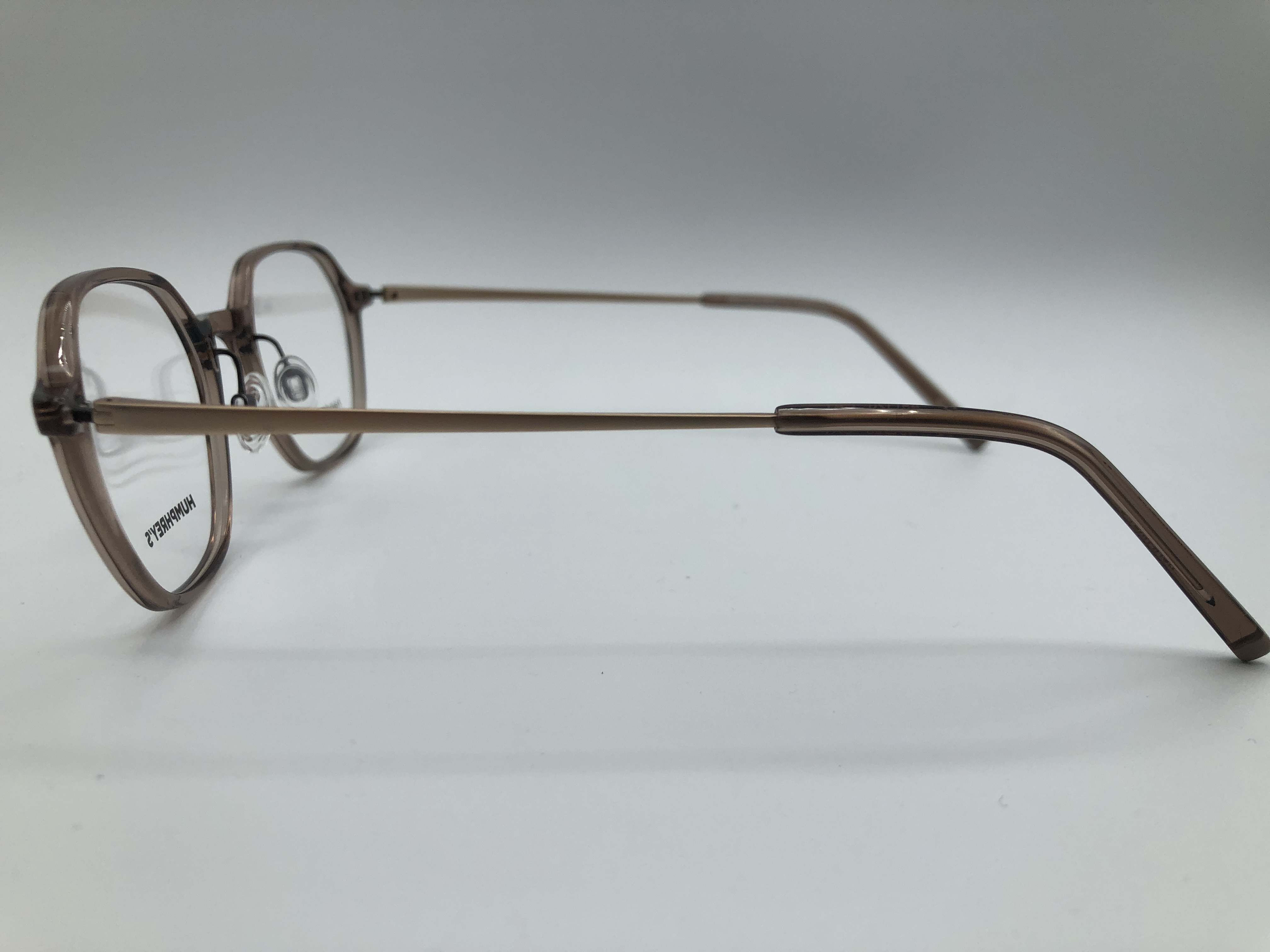Diese Fassung ist aus Acetate in einem leicht transperenten Taupe mit passenden rosegolden Metallbügeln.