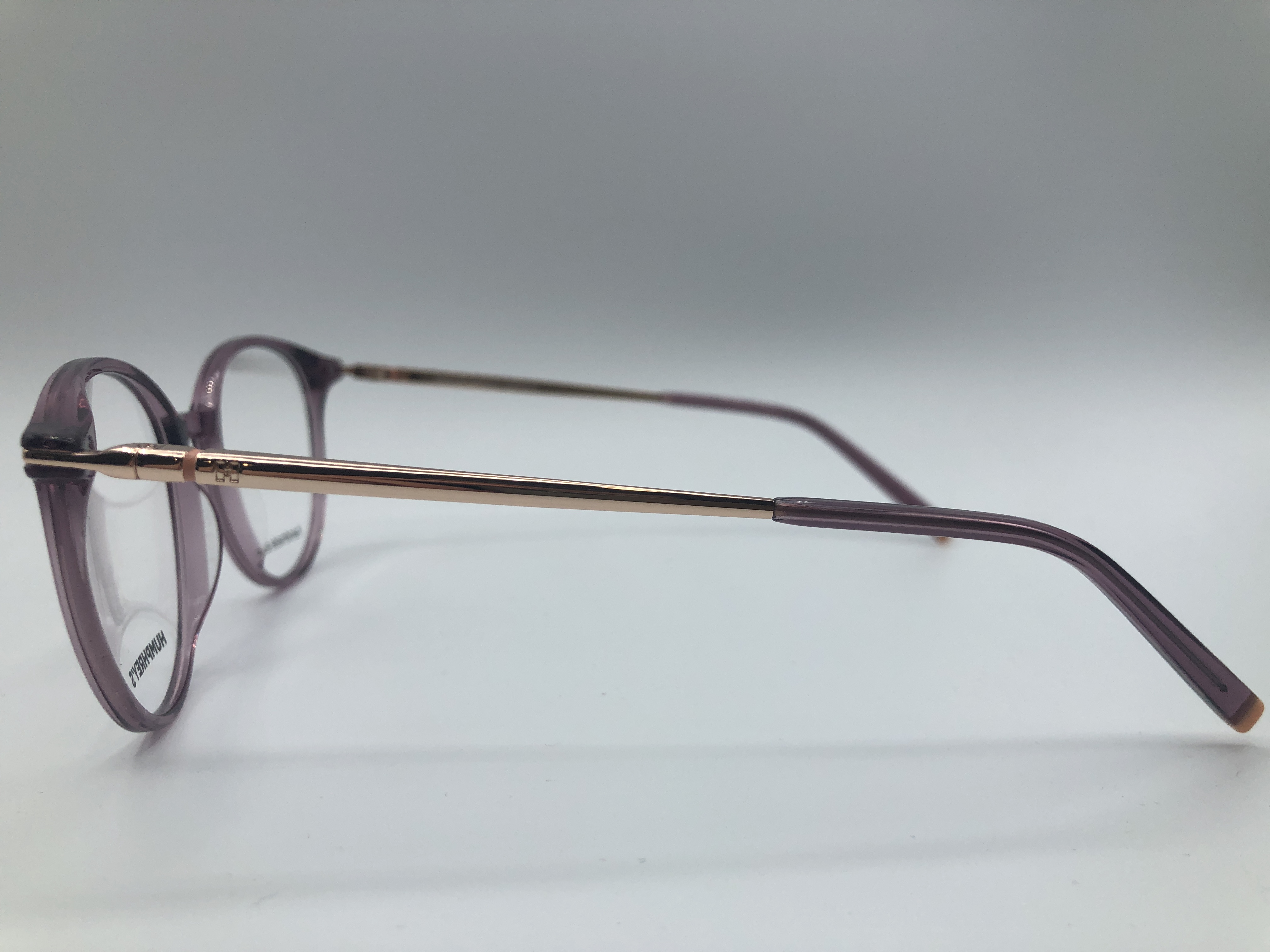 Diese Fassung in einem transparentem lila überzeugt mit passenden, eleganten rosegolden Bügeln.