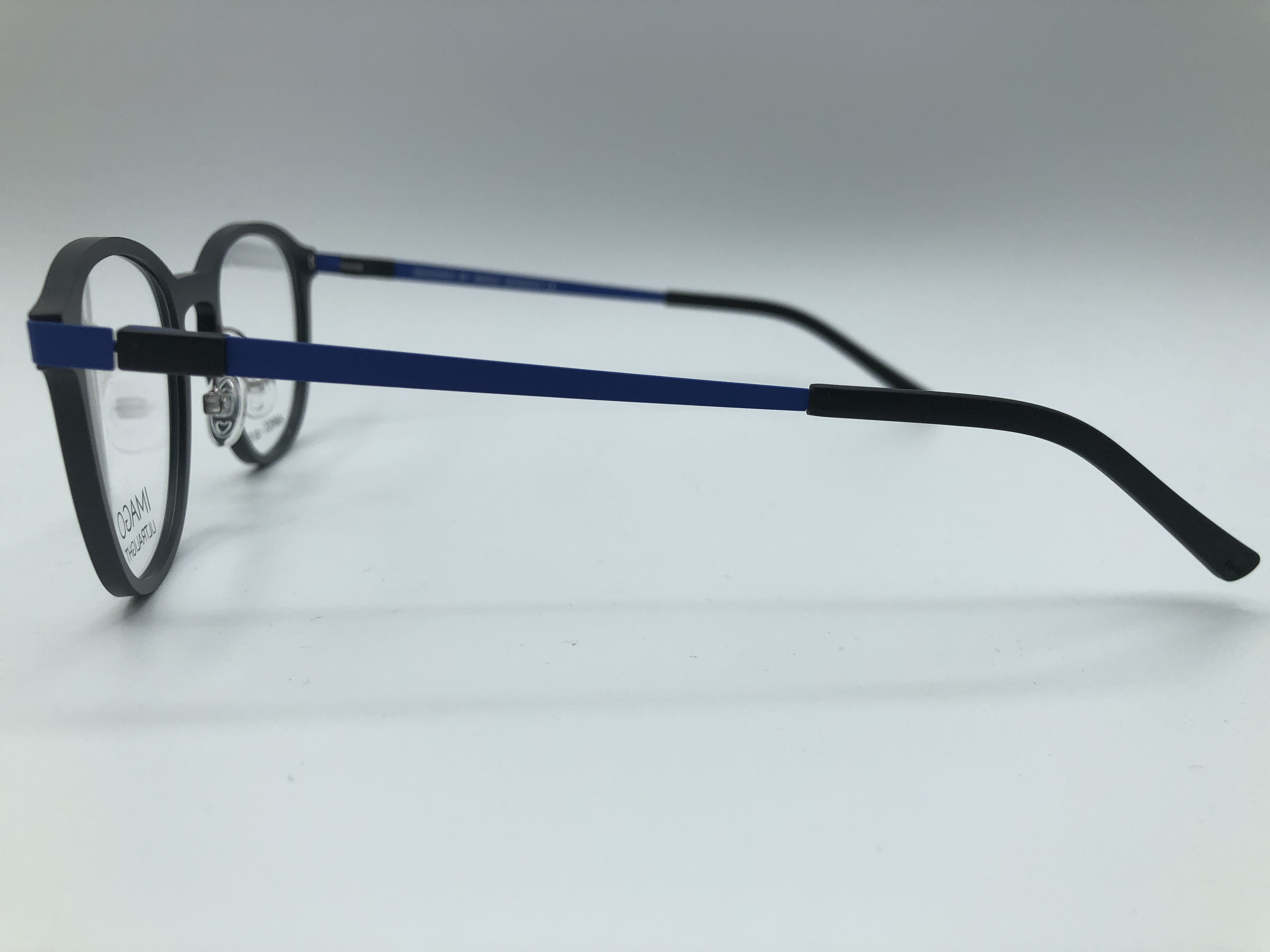Fassung von Imago Ultralight in matt schwarz mit blauen Bügeln.
