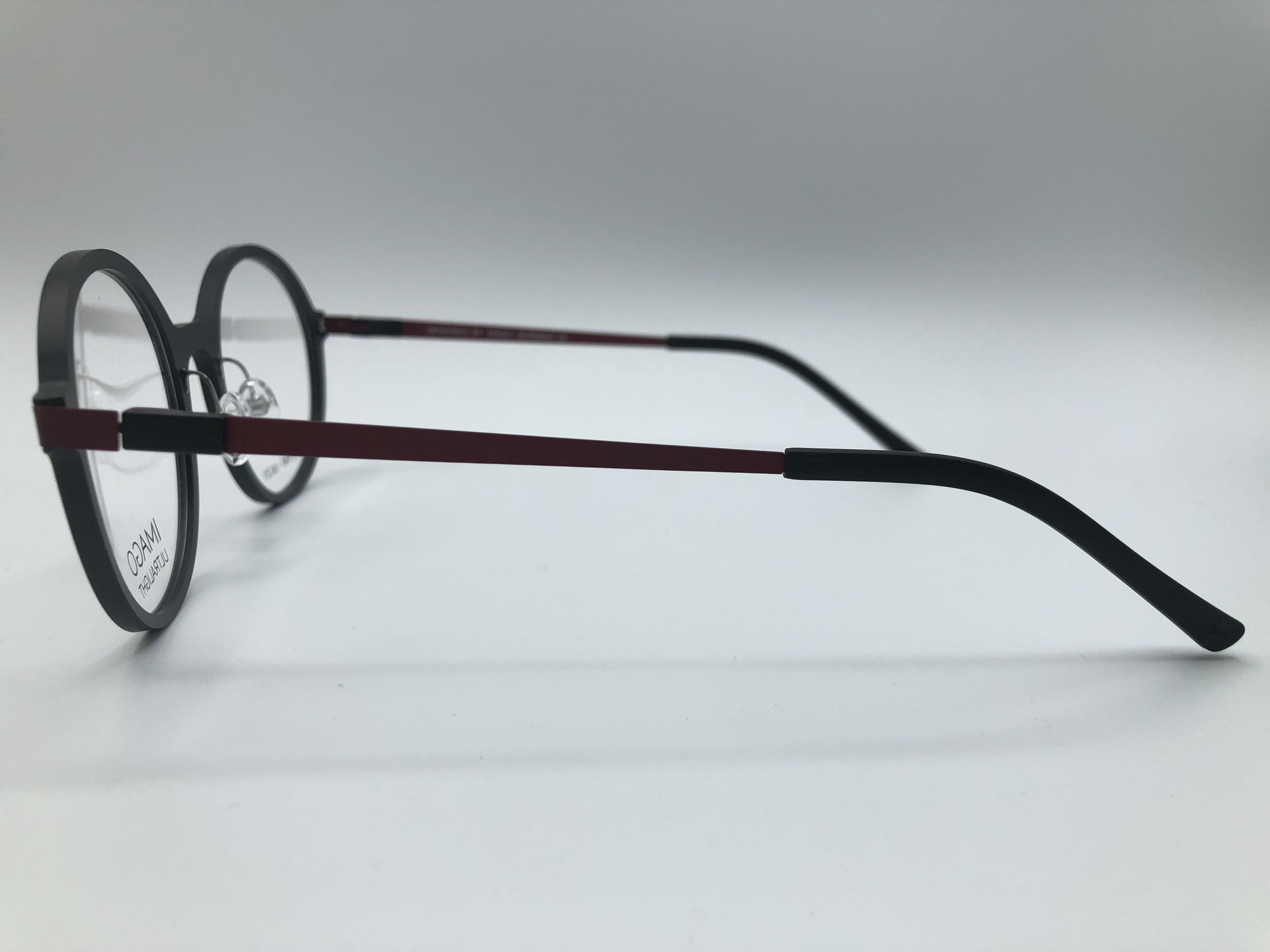 Fassung von Imago Ultralight in Schwarz mit roten Bügeln.