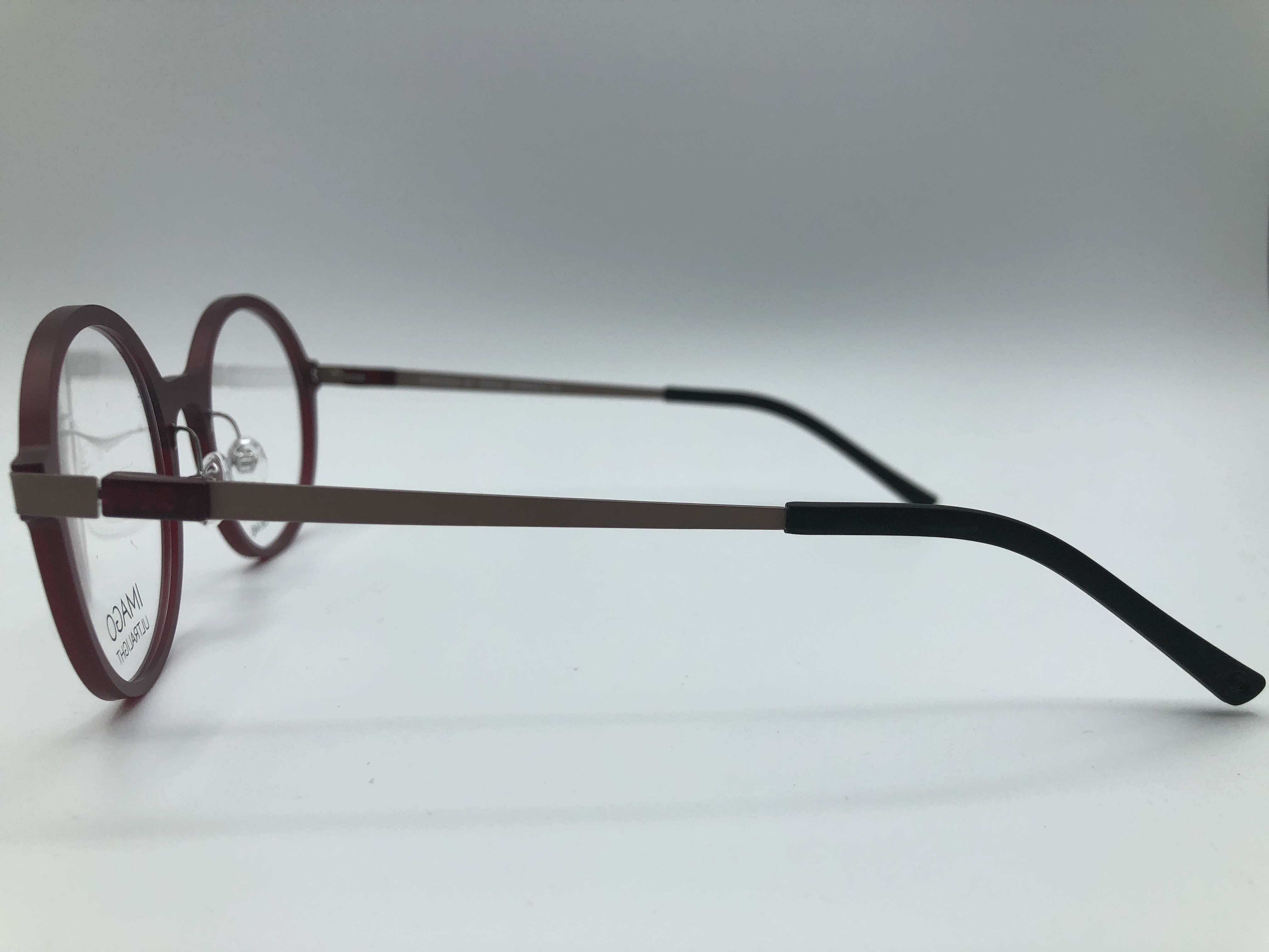 Fassung von Imago Ultralight in Rot mit beige matten Bügeln.