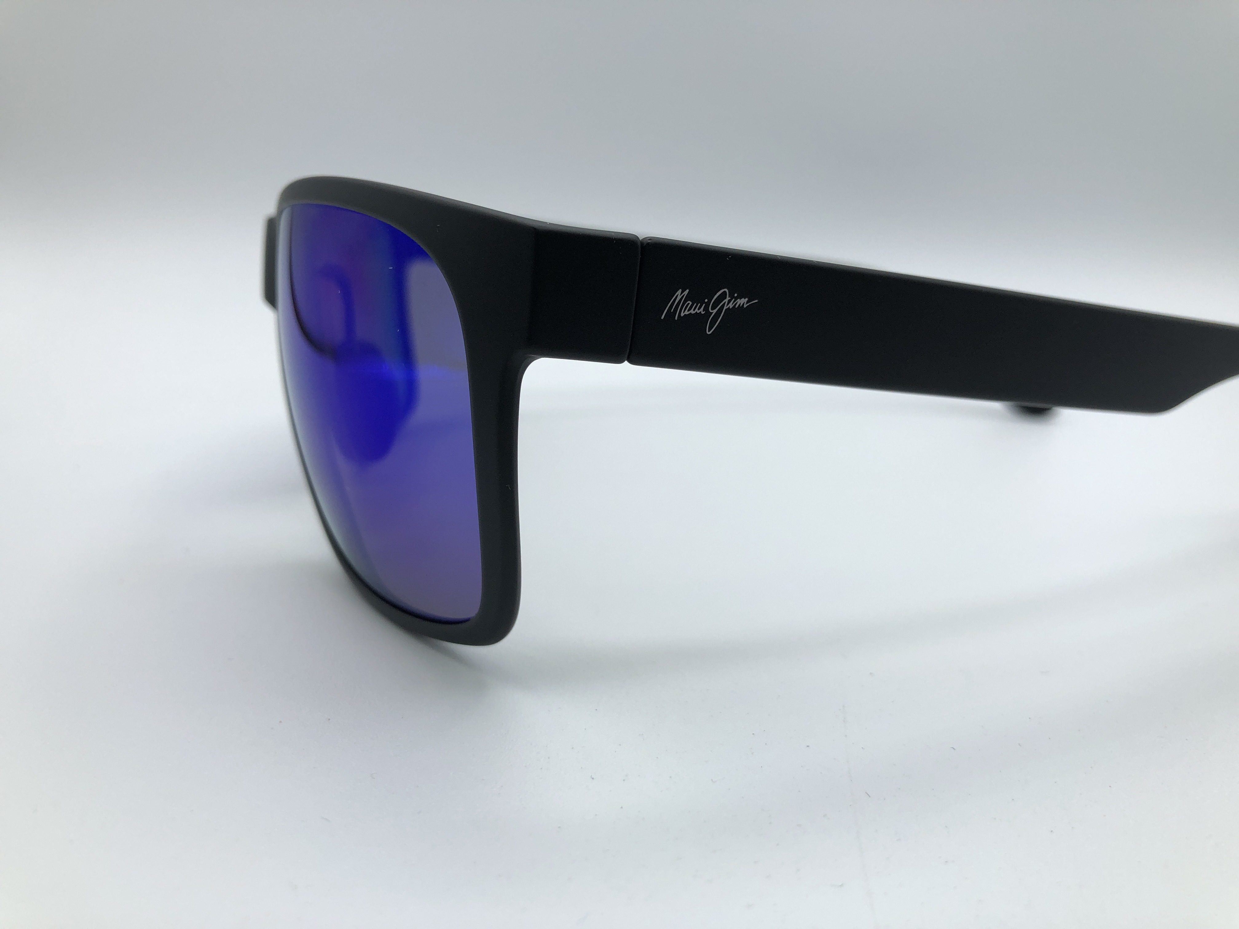 Moderne Kunststofffassung von Maui Jim in Matt schwarz mit grau polarisierten und blau verspiegelten Gläsern.