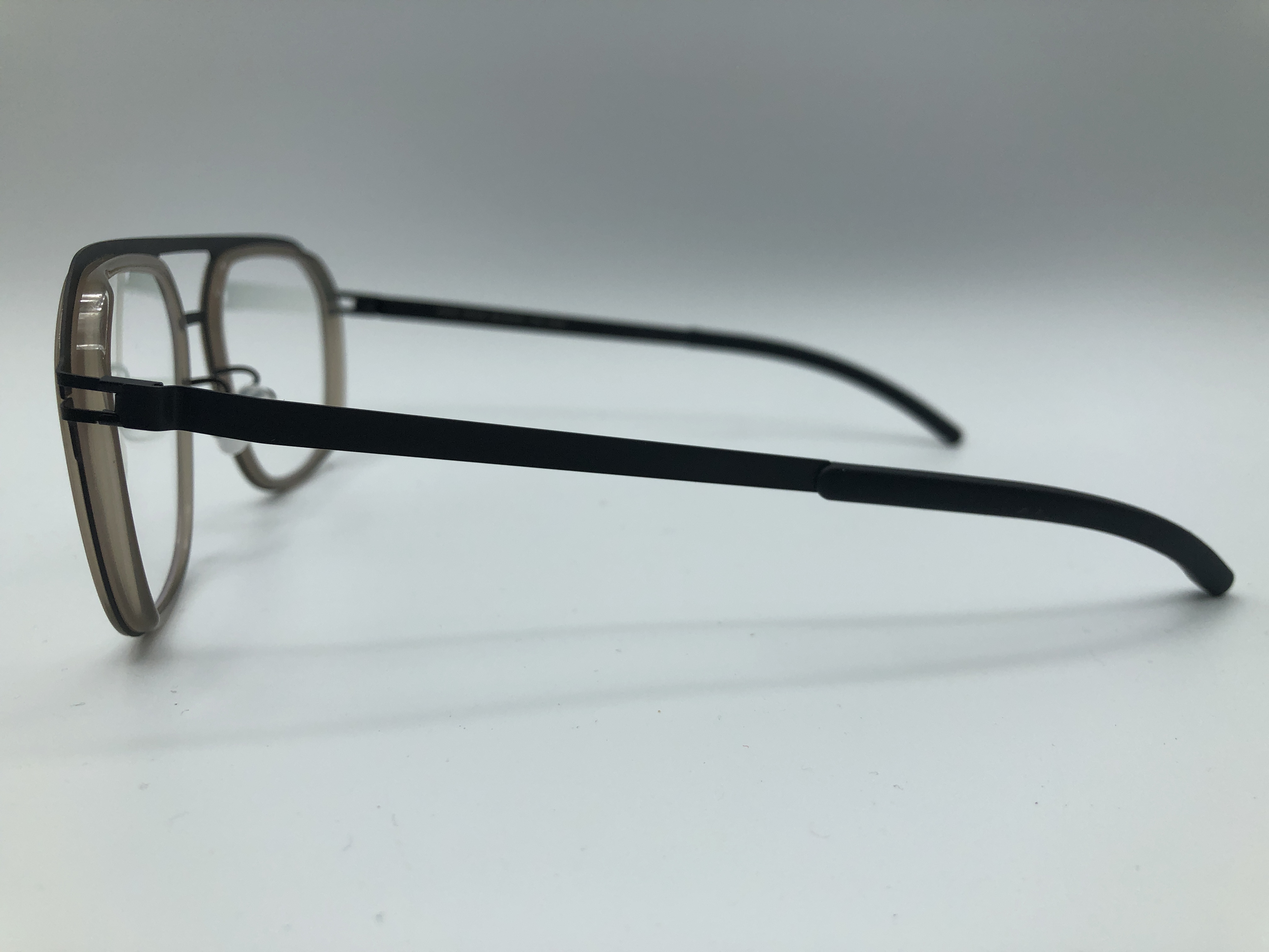 Modische Doppelsteg-Fassung von Mykita in Taupe/ Schwarz. Handgefertigt aus hochwertigem Acetat und Edelstahl.