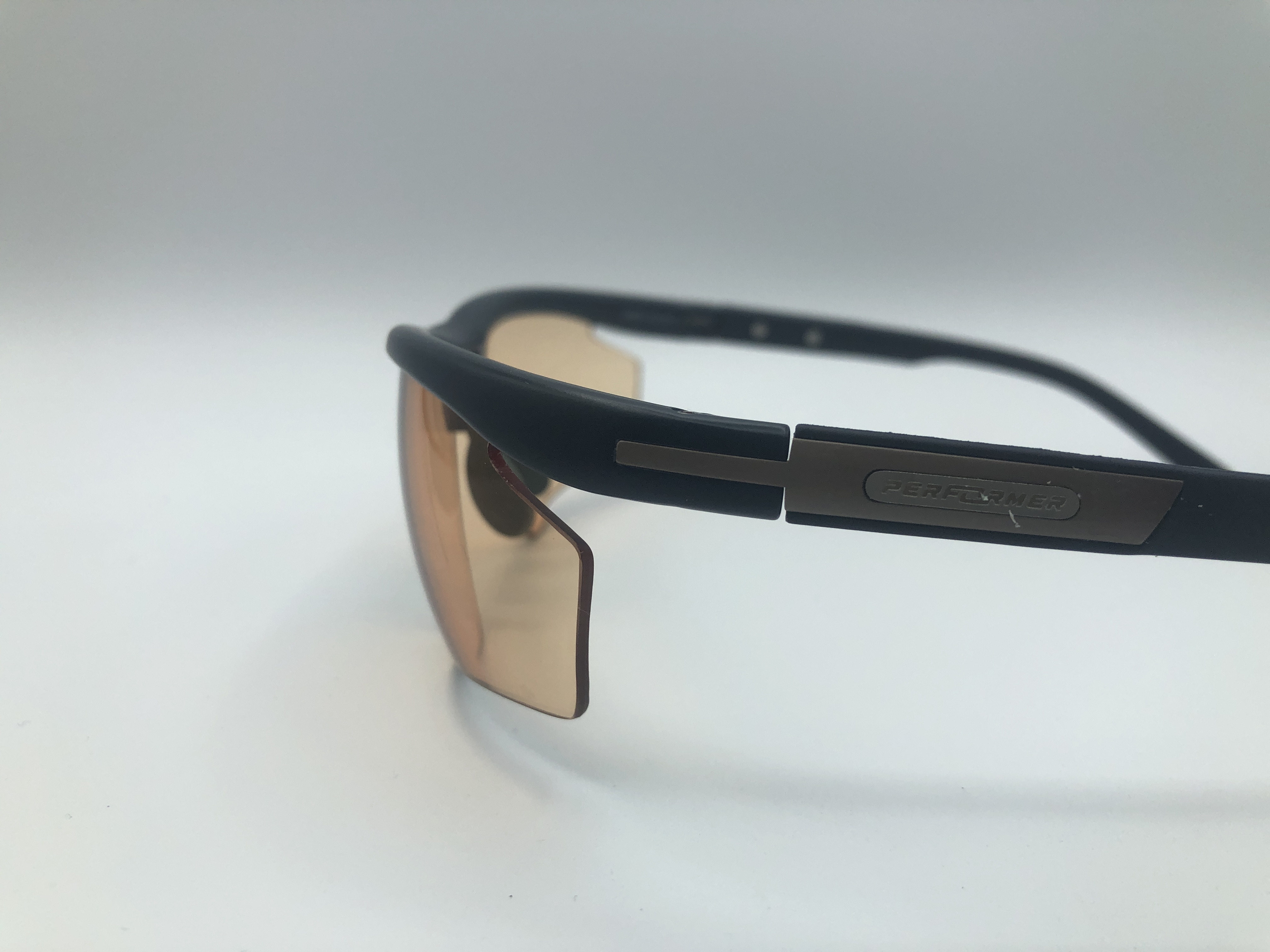 Sportbrille von Performer in blau mit orangen, konstraststeigernden Gläsern.