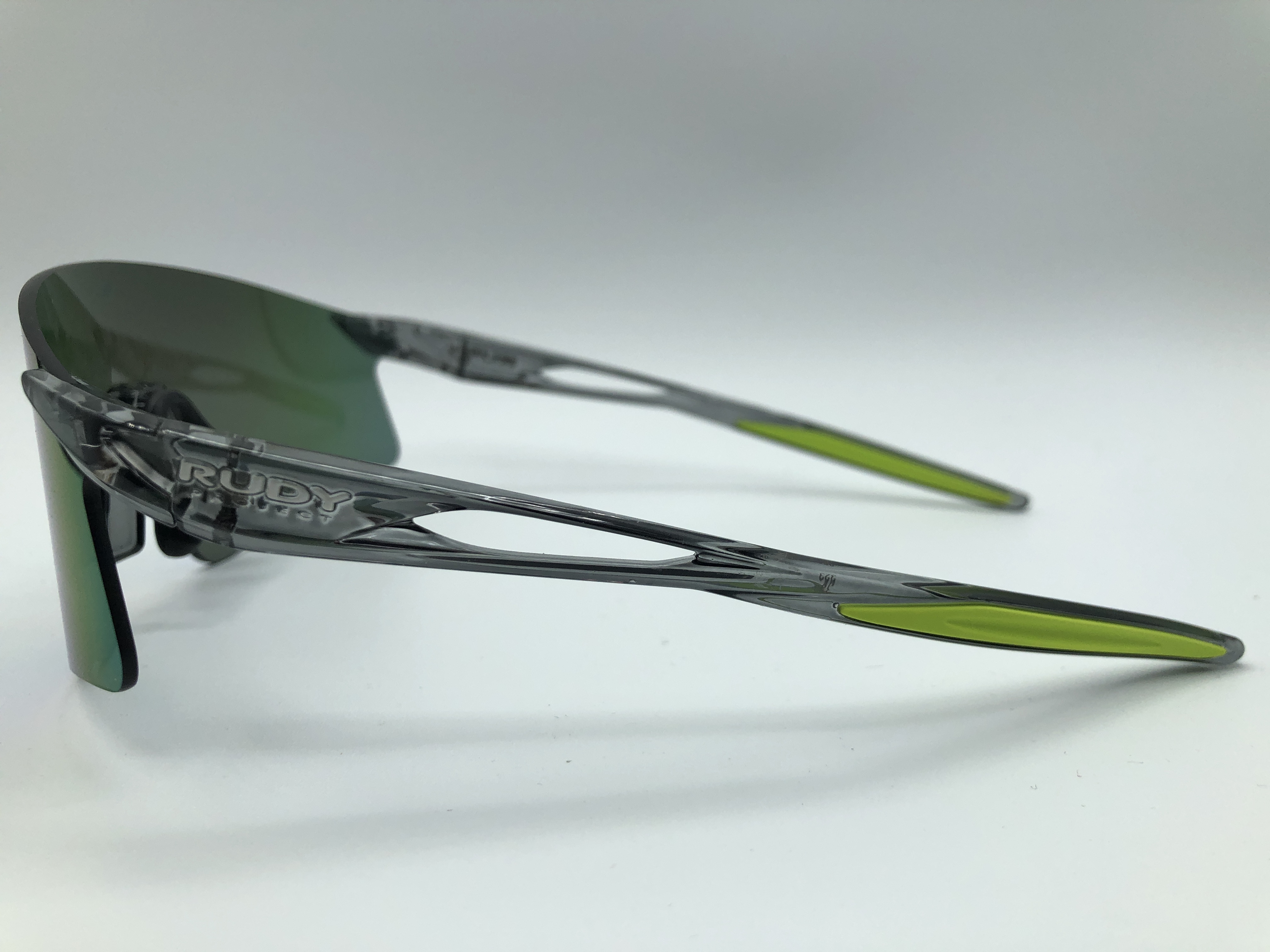Sportbrille von Rudy Project mit einen durch gehenden grau getönten Glas. Die Verspiegelung ist blau/ grün/ violett.