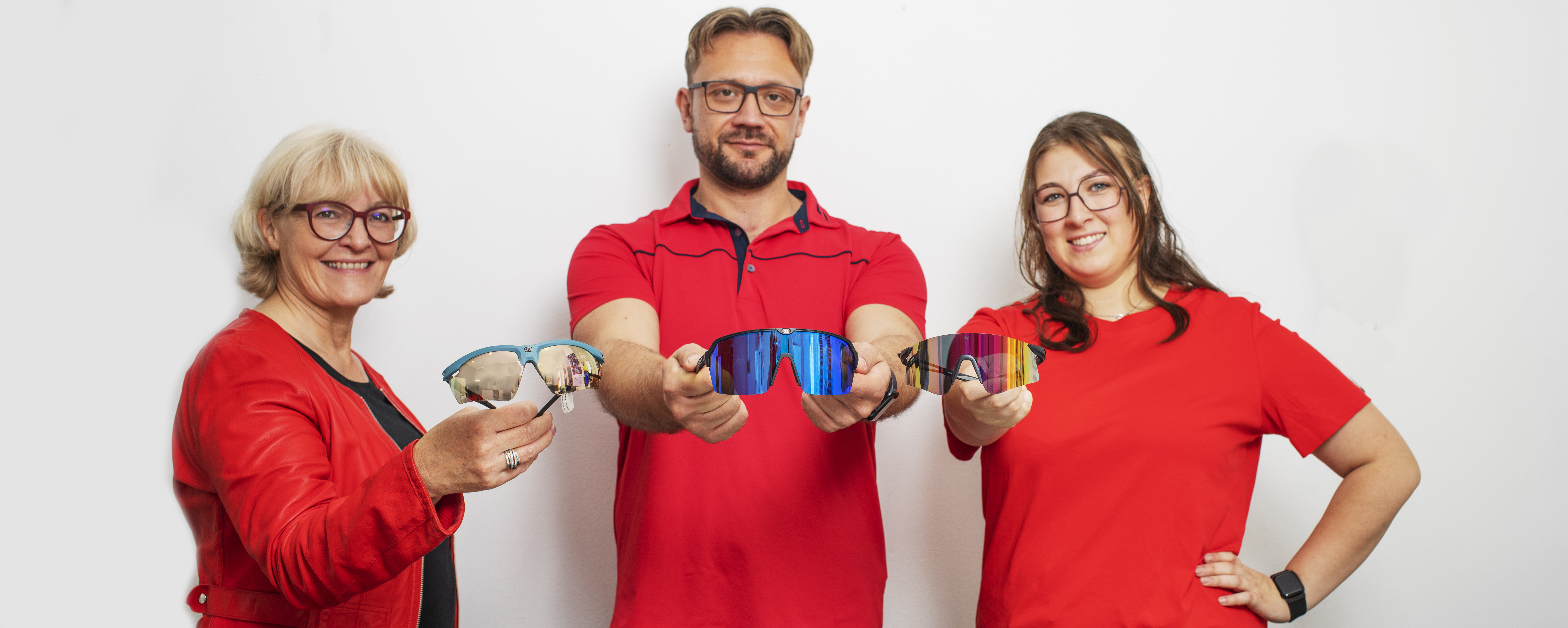Sportbrille in Blau/ Rot mit impactx 2 red (Selbsttönenden) Gläsern.