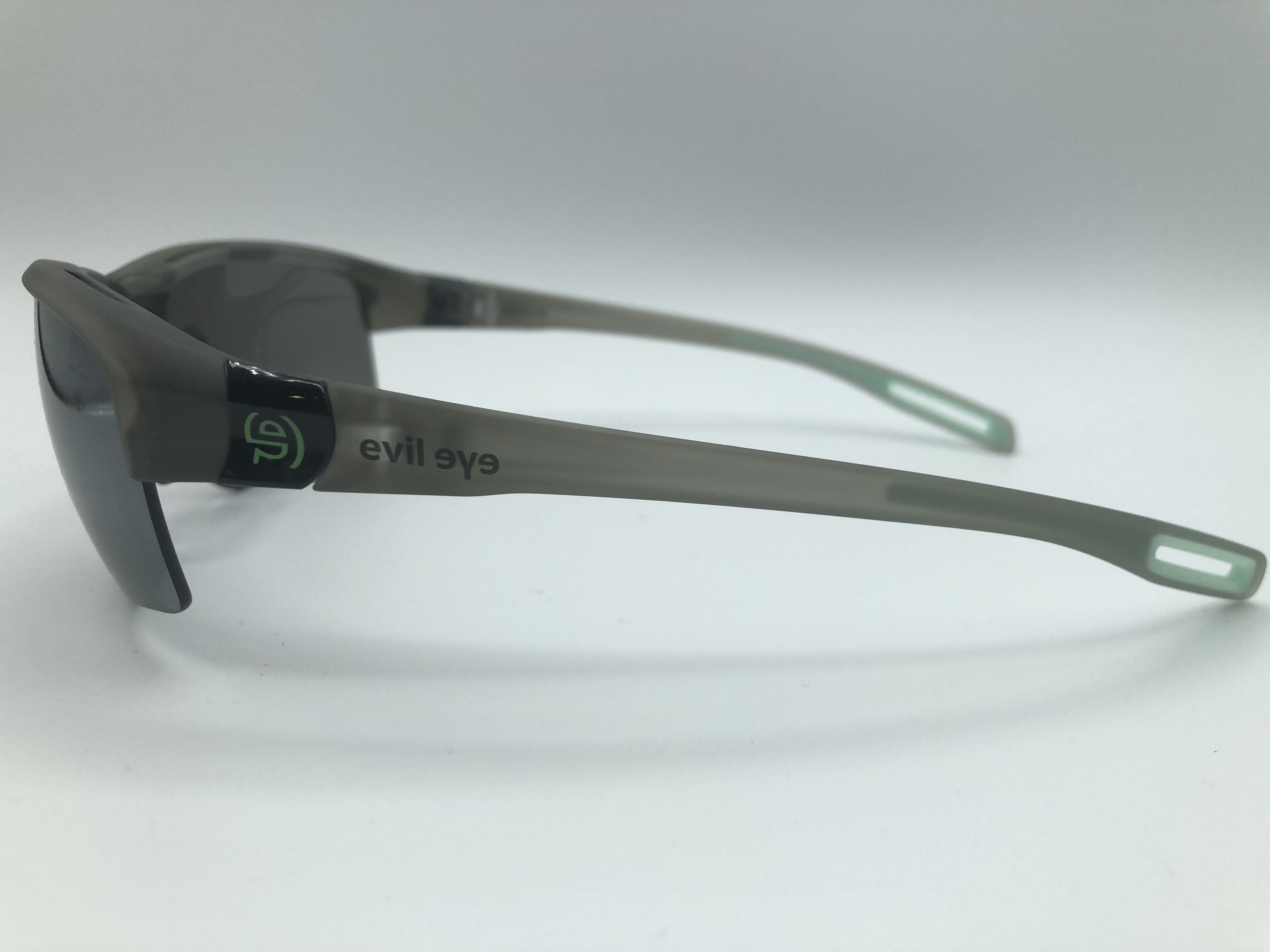 Graue Sportbrille mit mint-grünen Akzenten und grauen Gläsern