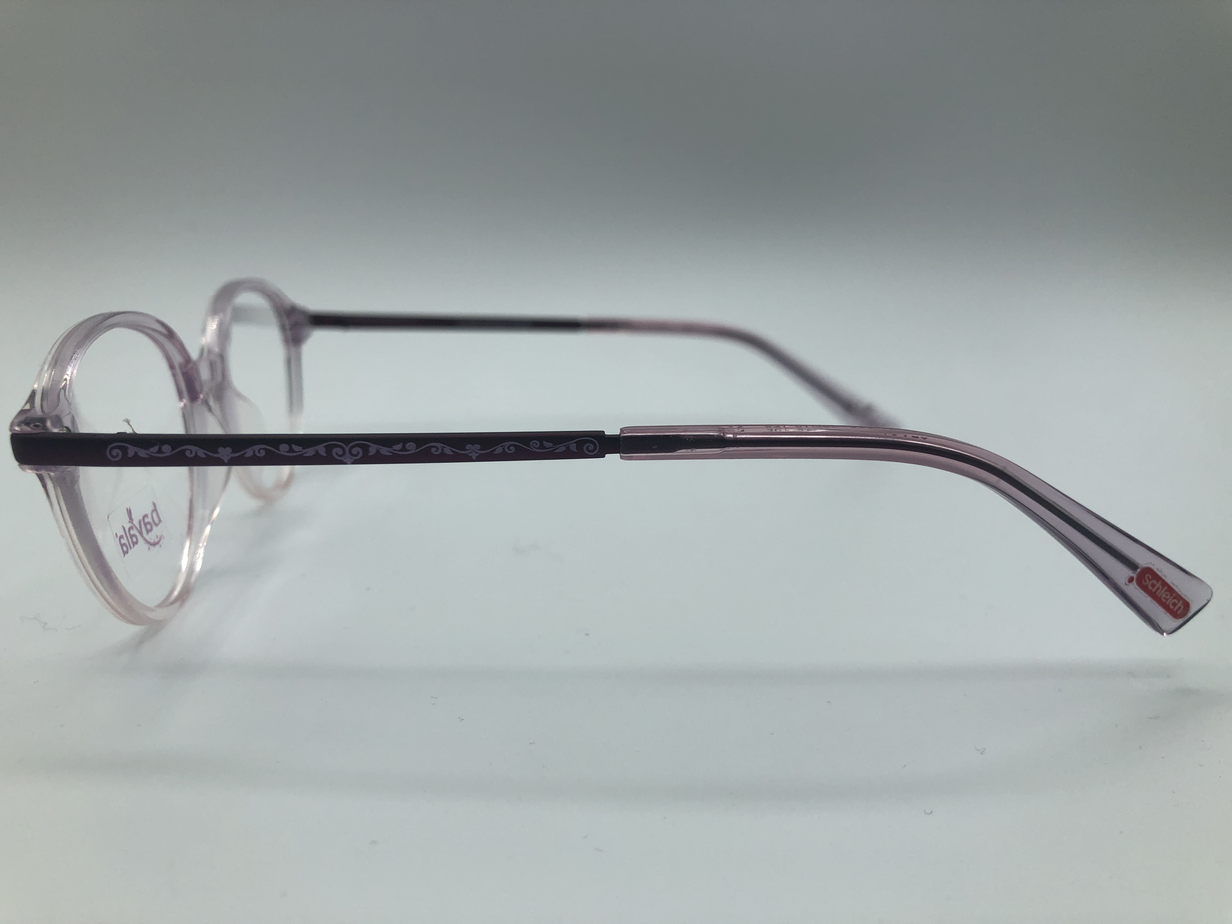 Transperente Acetate Fassung mit einem leichten Lilaton und Magentafarbende Bügeln mit einem Muster. Die Bügel haben ein Federschanier.