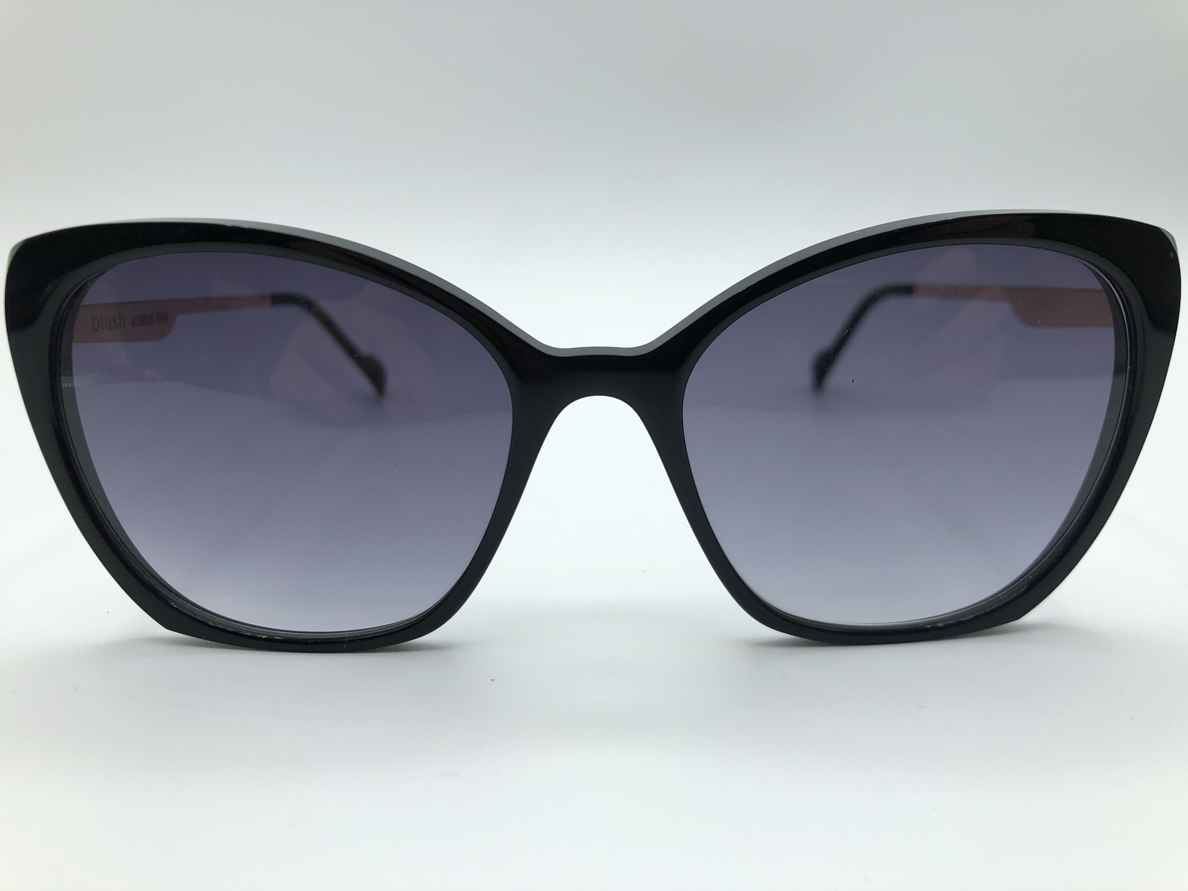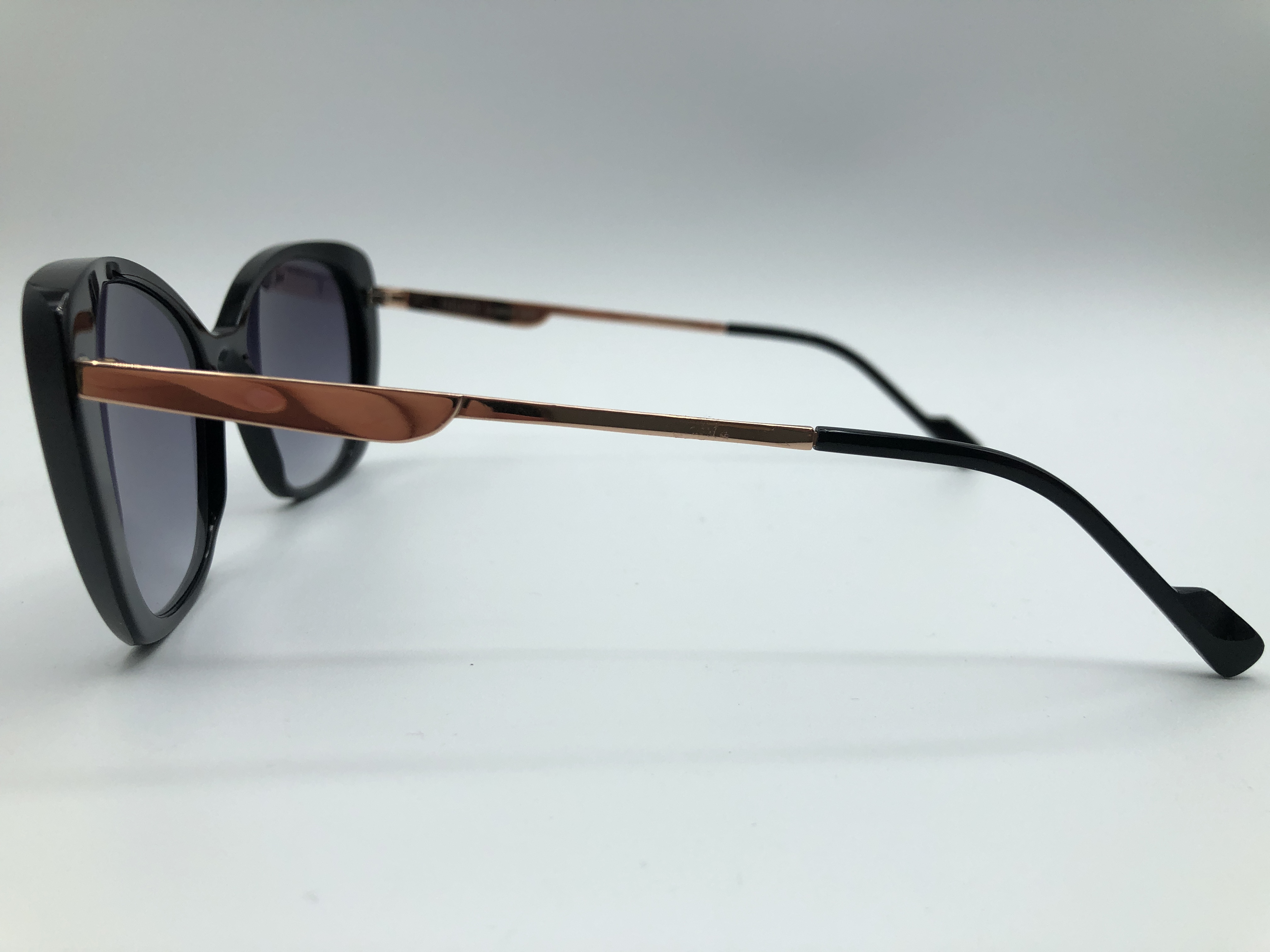 Schwarze Acetatfassung mit rosegoldenen Metallbügeln. Die Fassung ist in Schmetterlingsform und hat graue Verlaufsgläser.