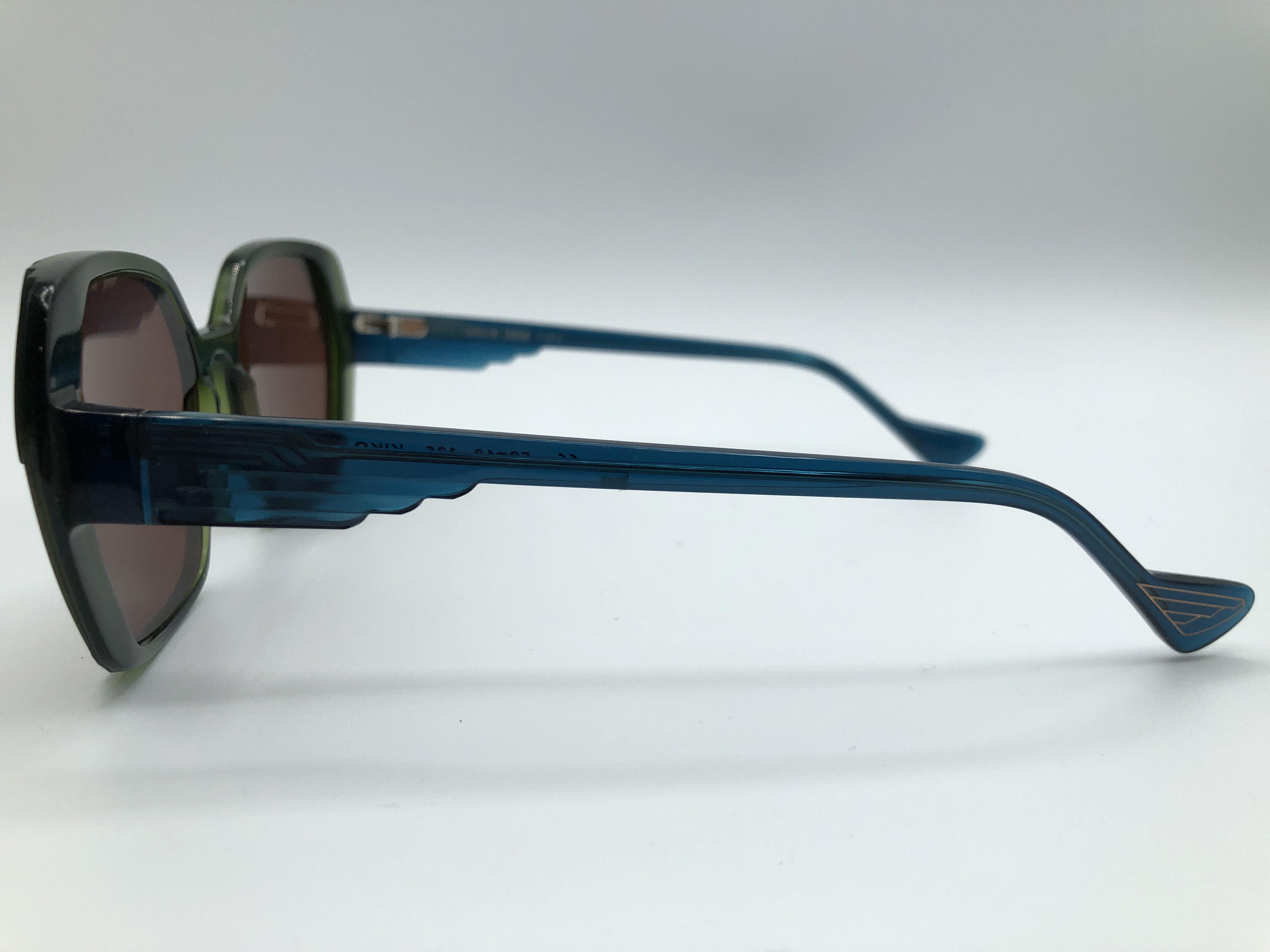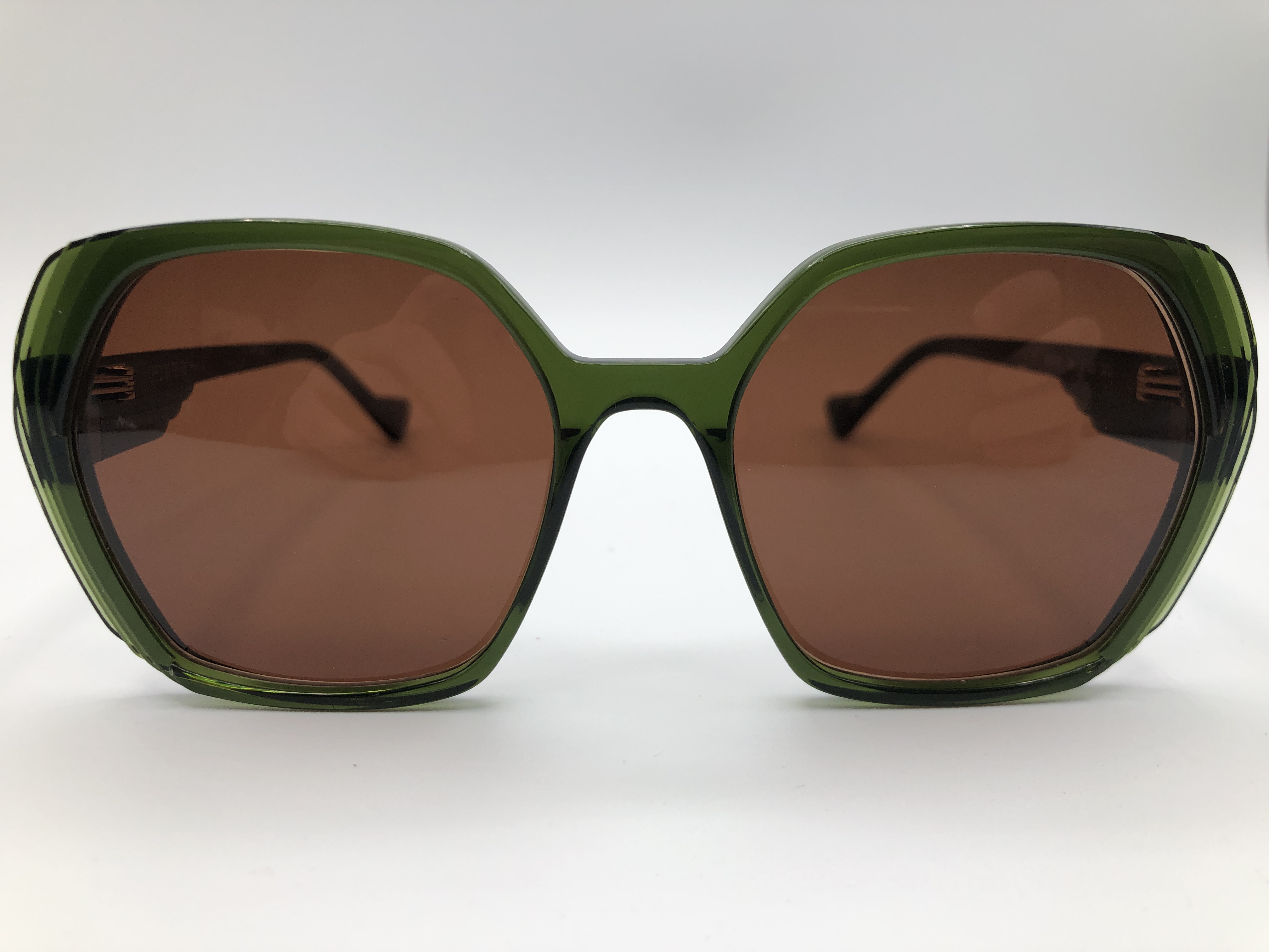 Sechseckige Acetate Fassung in grün mit türkisen Bügeln.