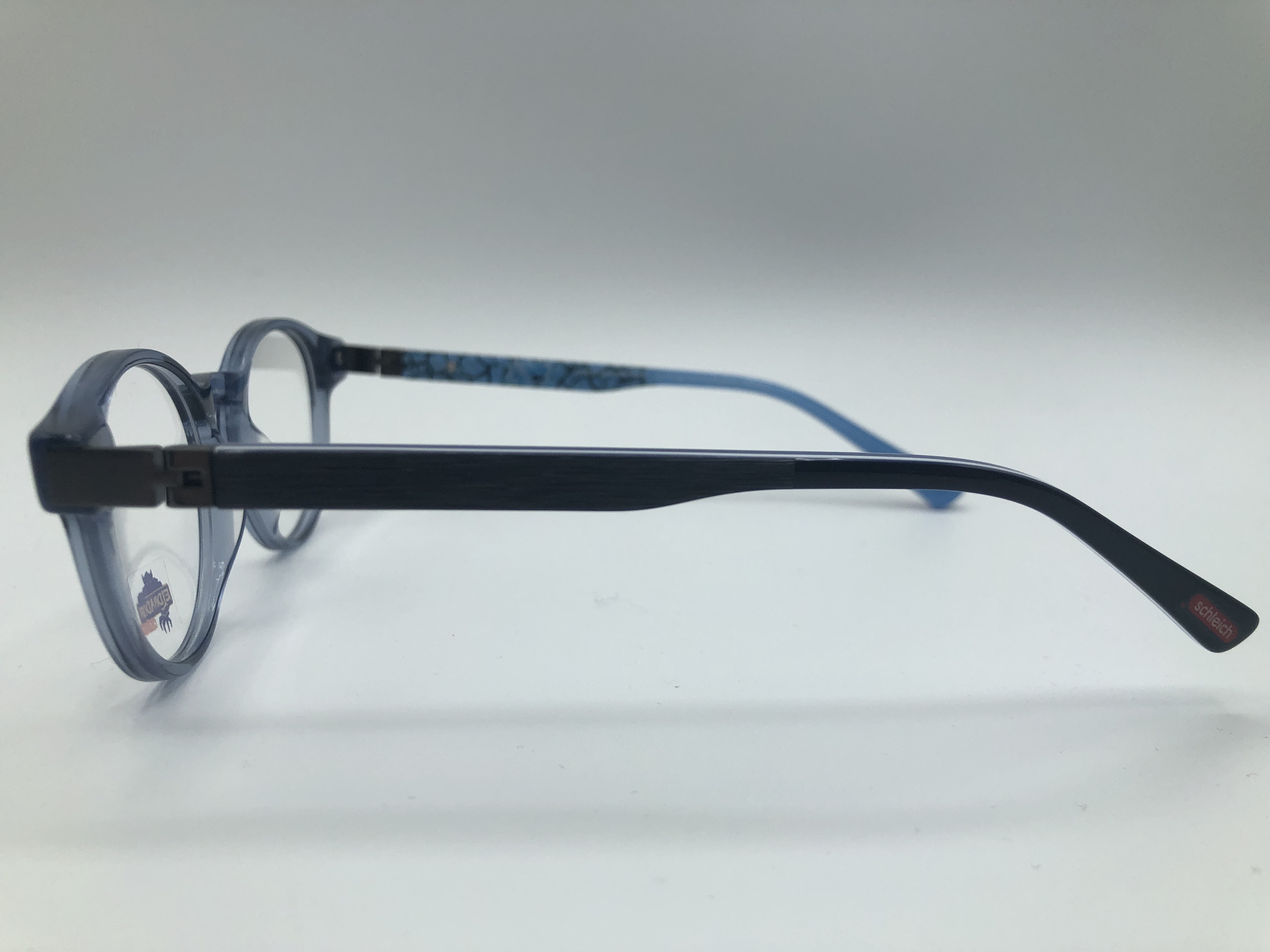 Acetate Fassung in Dunkelblau mit grauen Bügeln. Die Bügel haben ein 180° Schanier und sind daher sehr beweglich.