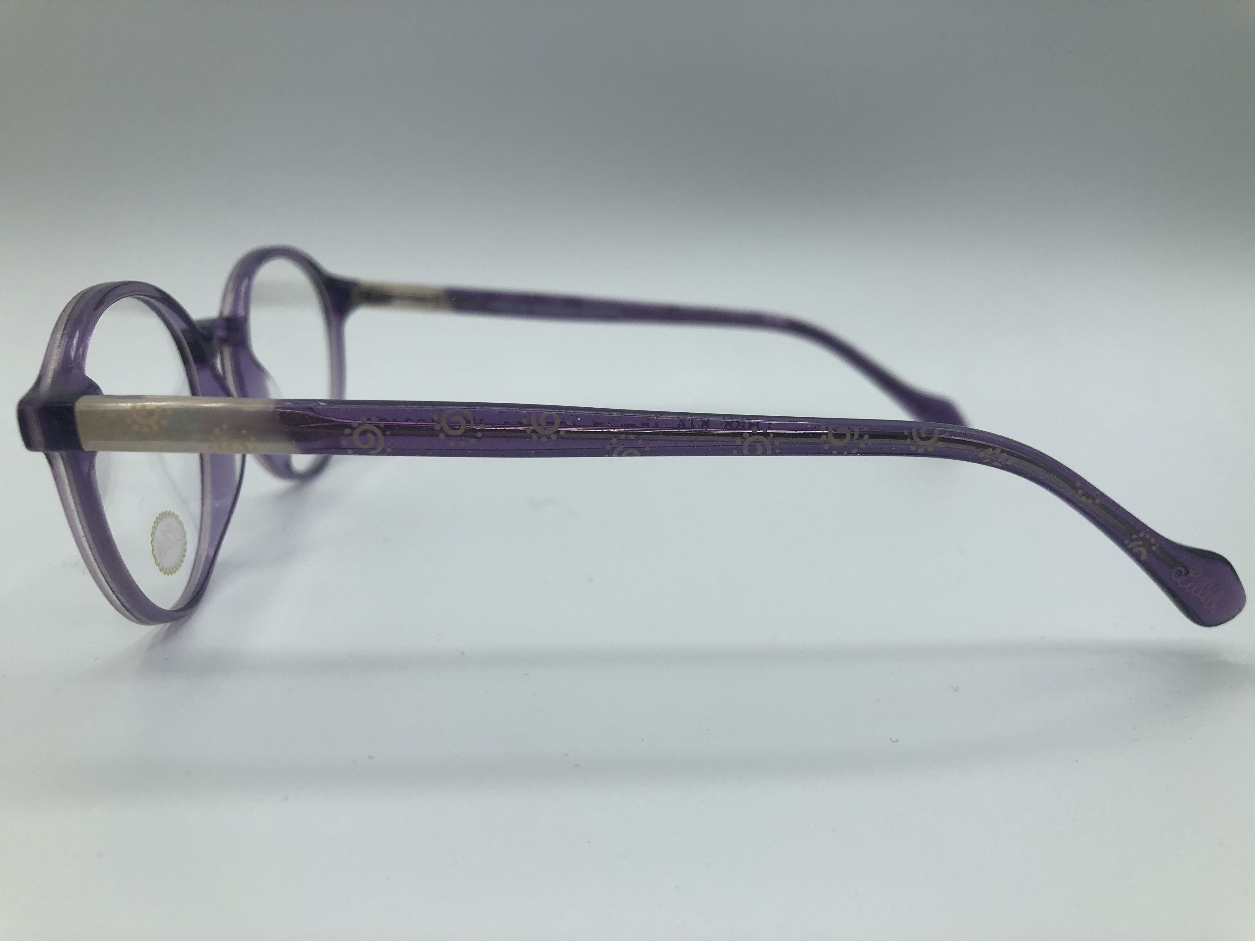 Glizernde lilane Acetate Fassung mit gemusterten lilanen Acetate Bügeln.Die Bügel haben ein Federschanier.