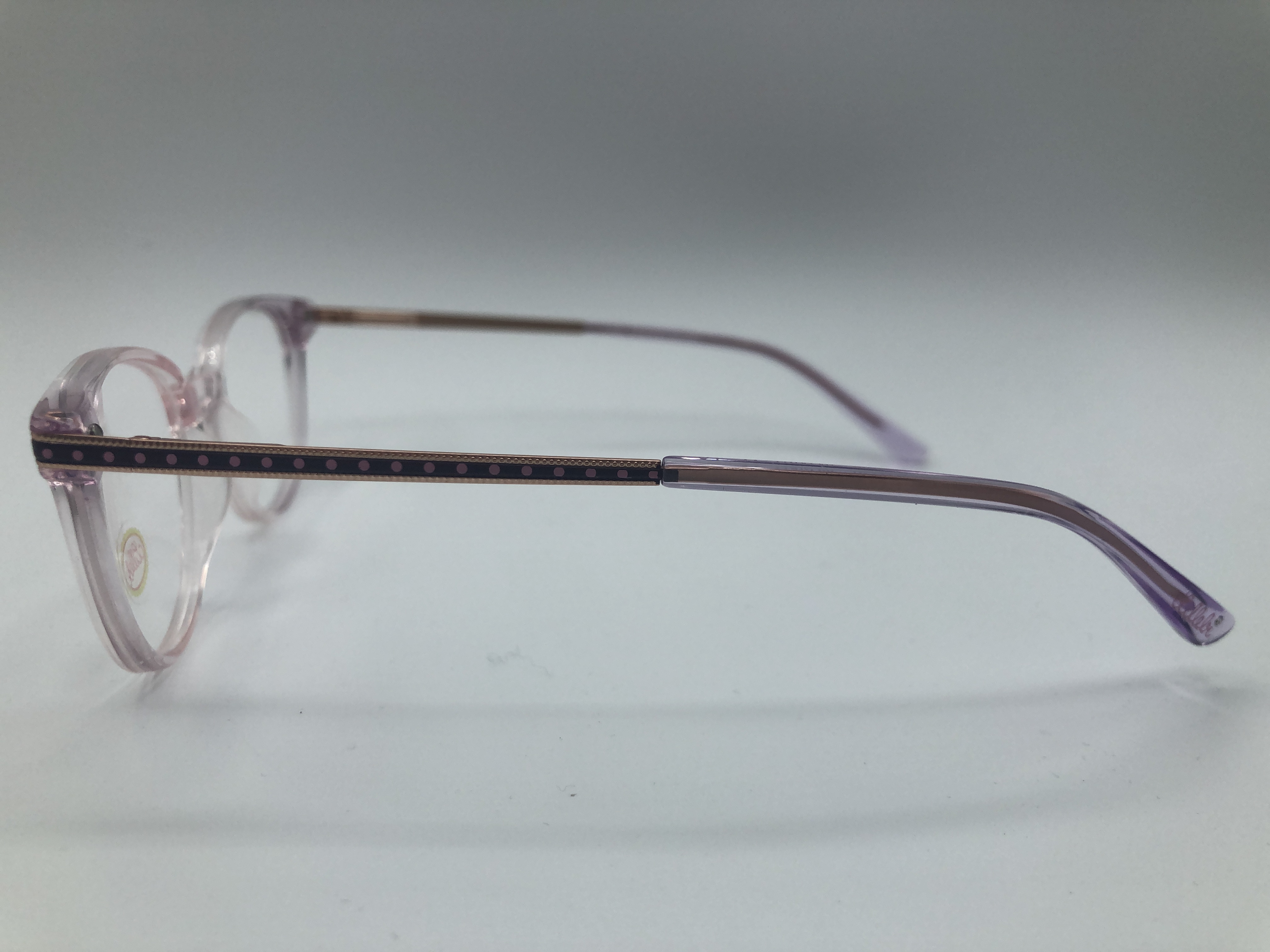 Transperente Acetate Fassung mit einem leichte Rosaton. Die Metallbügel sind Rosefrabend, haben ein Muster und ein Federschanier.