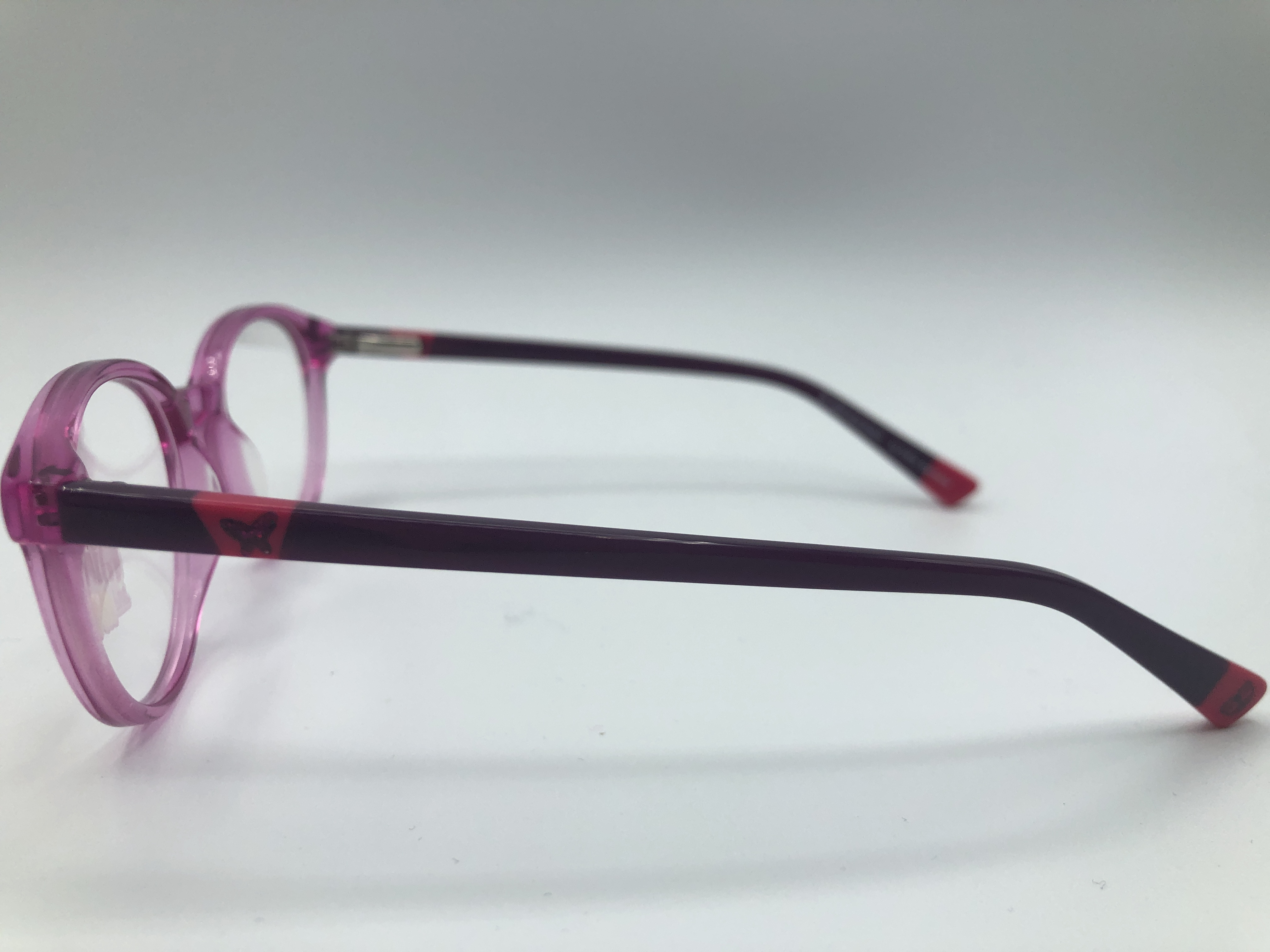 Rosatransperente Acetate Fassung mit dunkel lilanen Acetate Bügeln.Die Bügel haben ein Federschanier.