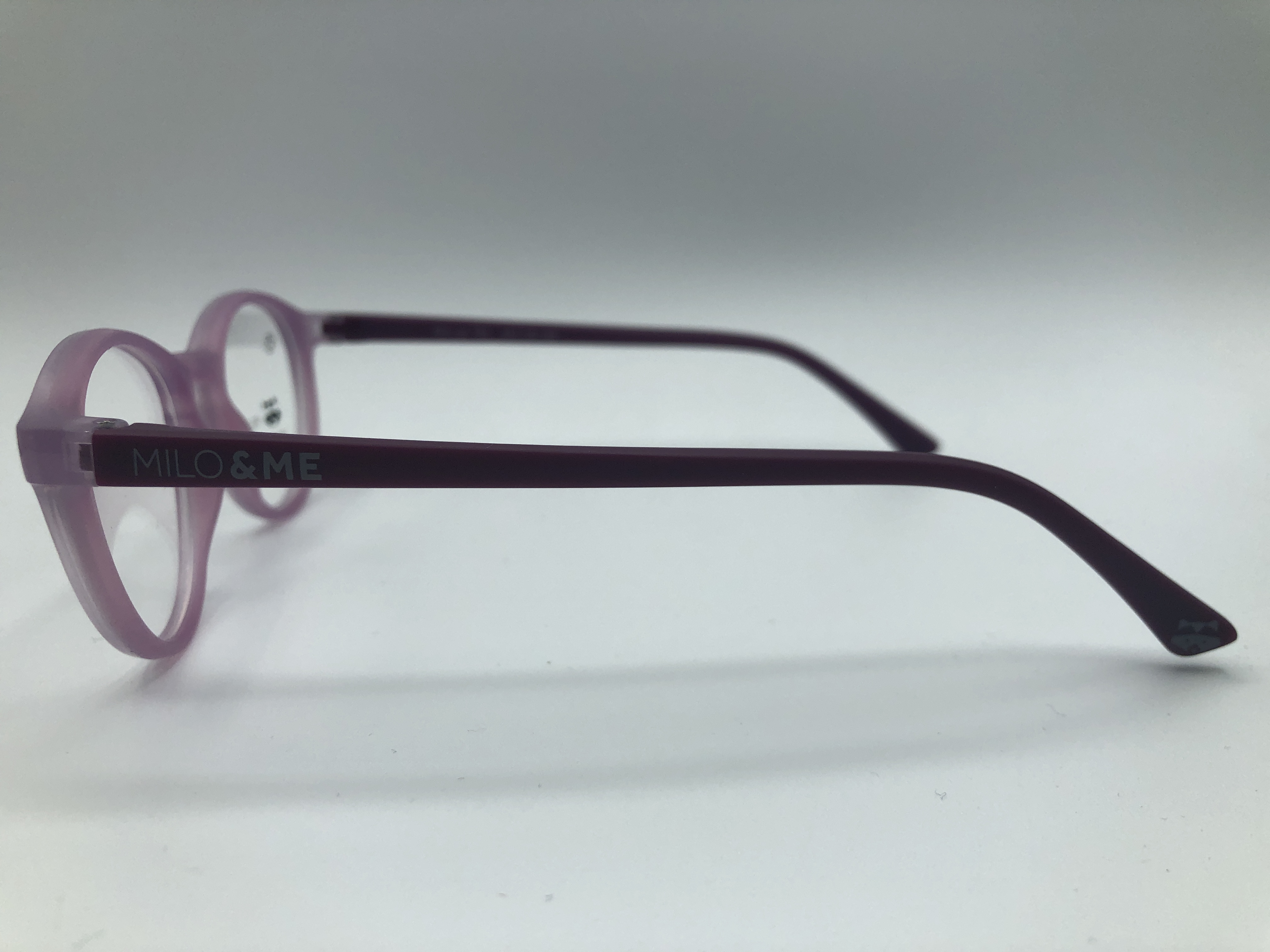 Flieder farbene Kinderbrille aus sehr robustem Kunststoff. Die Bügel sind in einem dunklerem Lila, können individuell angepasst werden und sorgen so für einen optimalen Sitz.