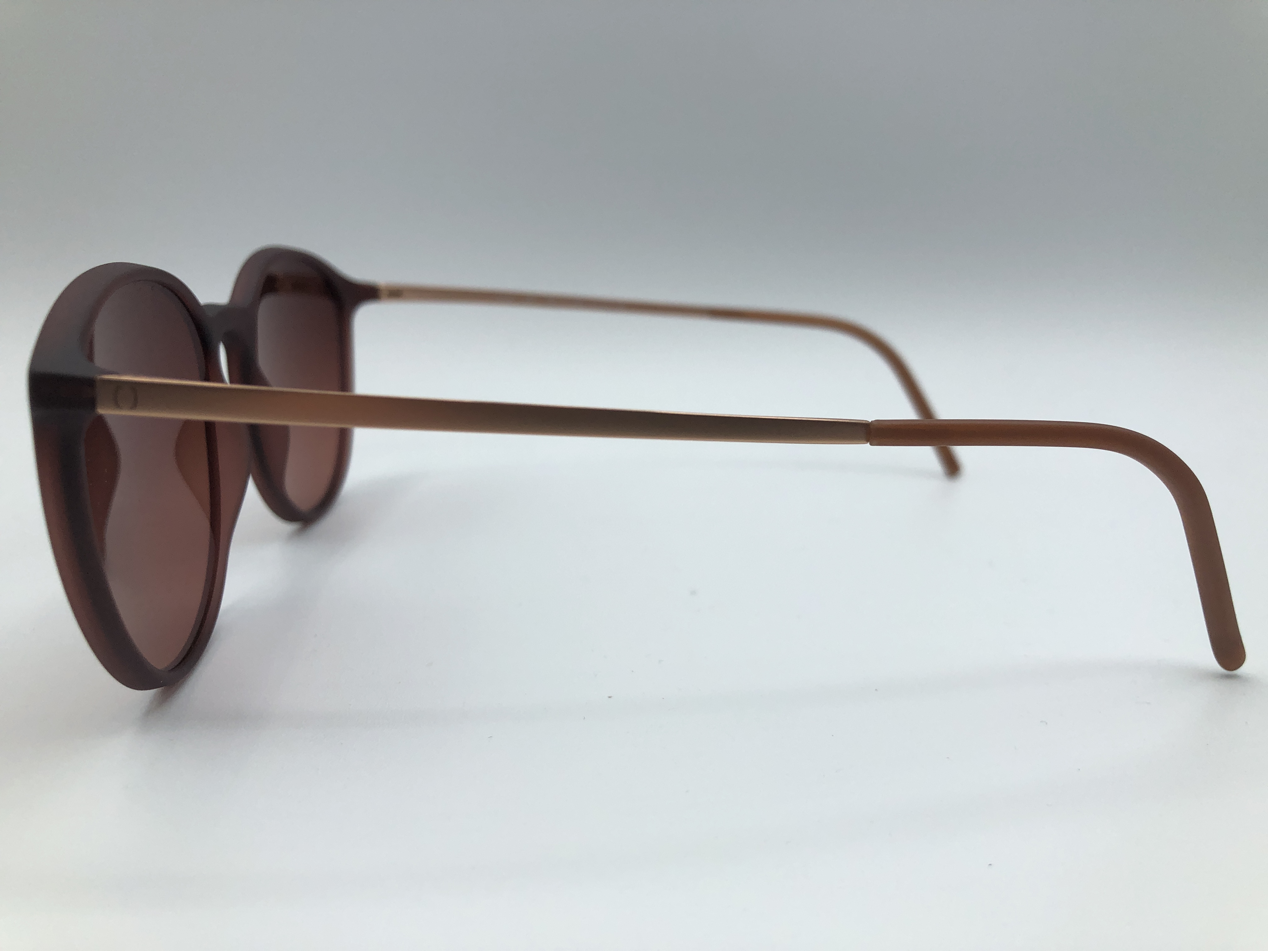 Moderne Sonnenbrille von Neubau in einem matten rot. Die Gläser sind rot/ bräunlich getönt, die Bügel sind in einem elegatem Rosegold und bestehen aus Edelstahl.