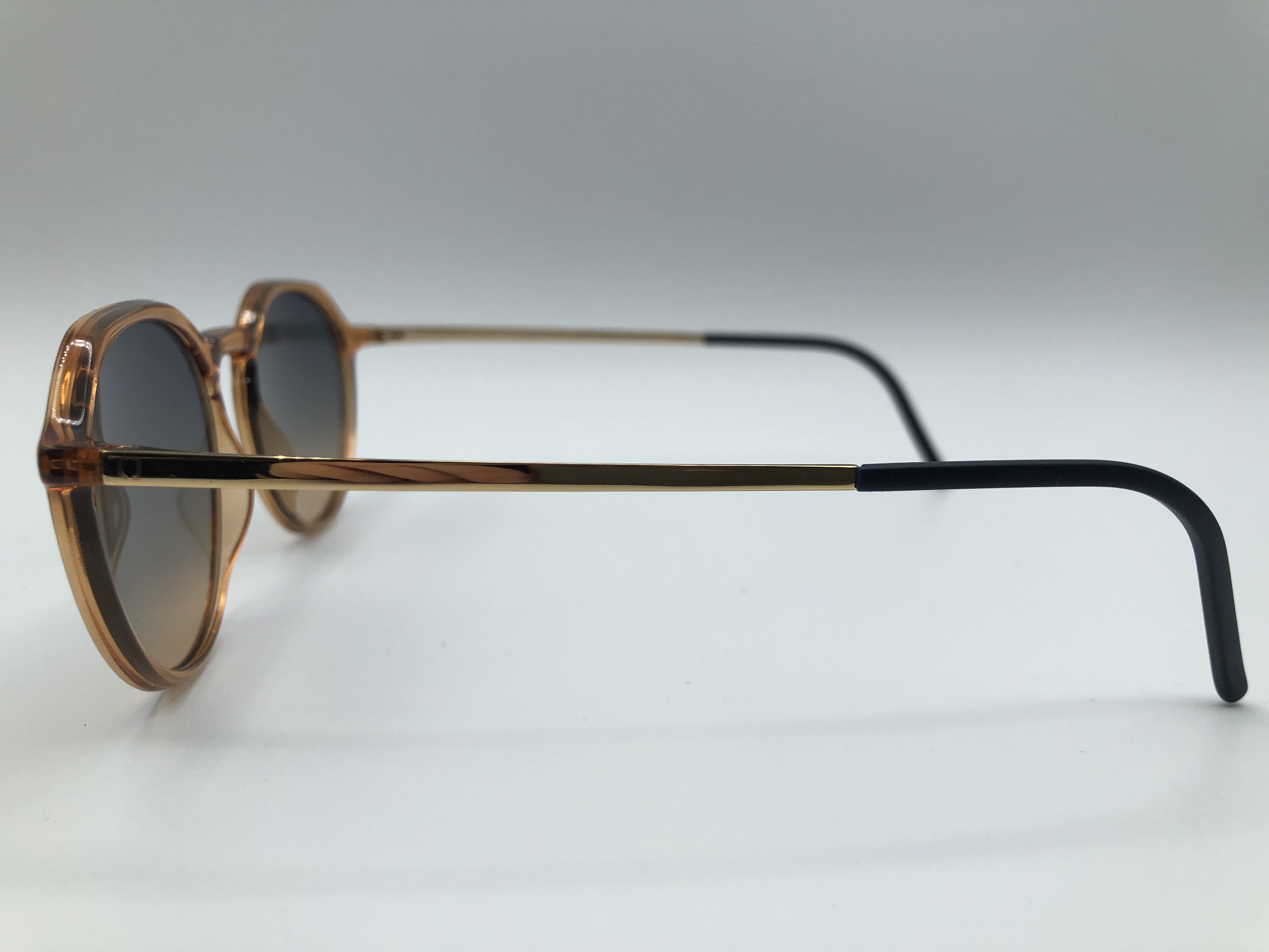 Orangene Acetatbrille mit goldenen Edelstahlbügeln und Blau- Orangenen Gläsern.