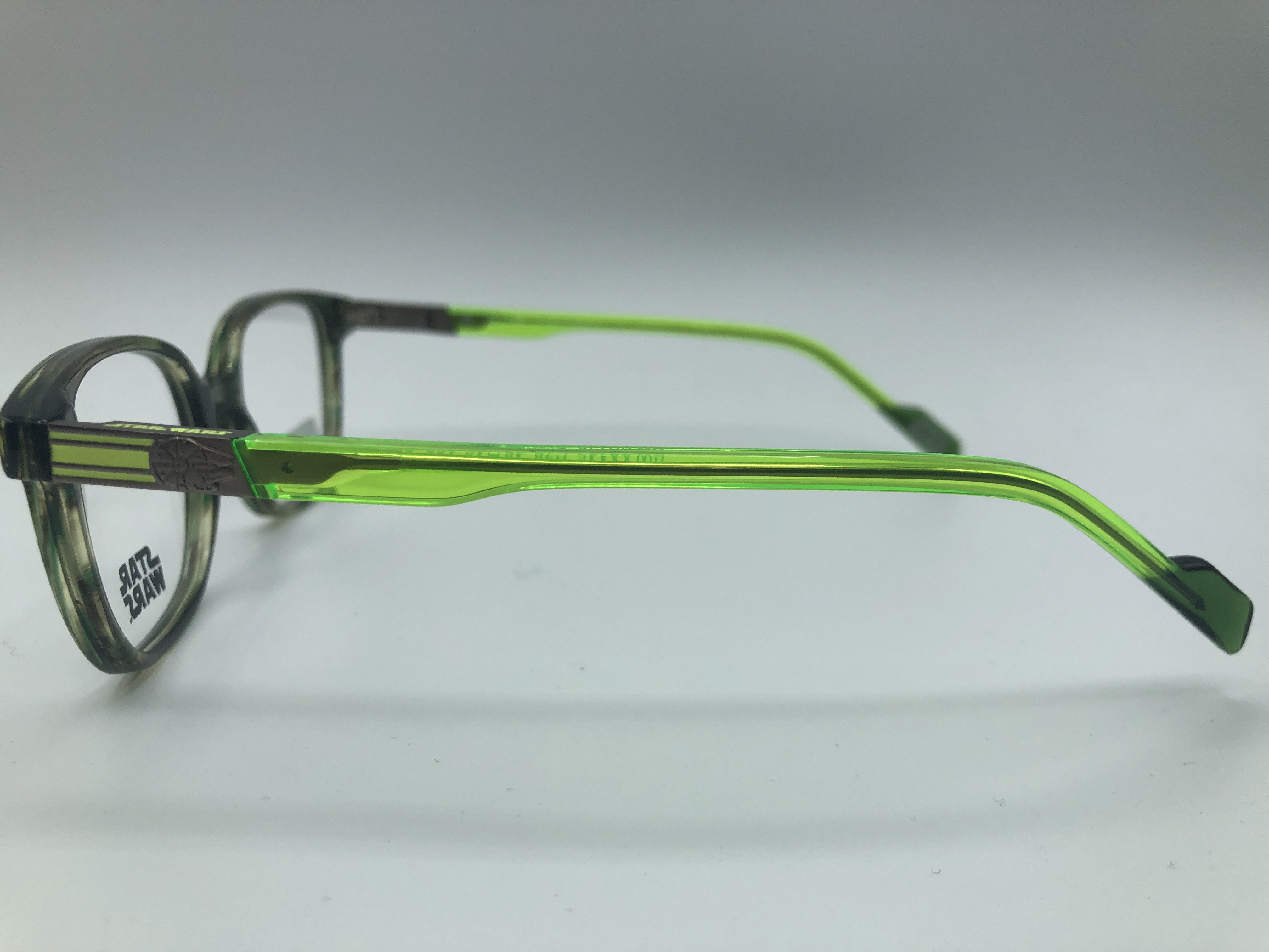 Grün marmorierte Acetate Fassung mit neon Grünen Bügeln die im Dukeln leuchten. Die Bügel haben ein Federschanier.