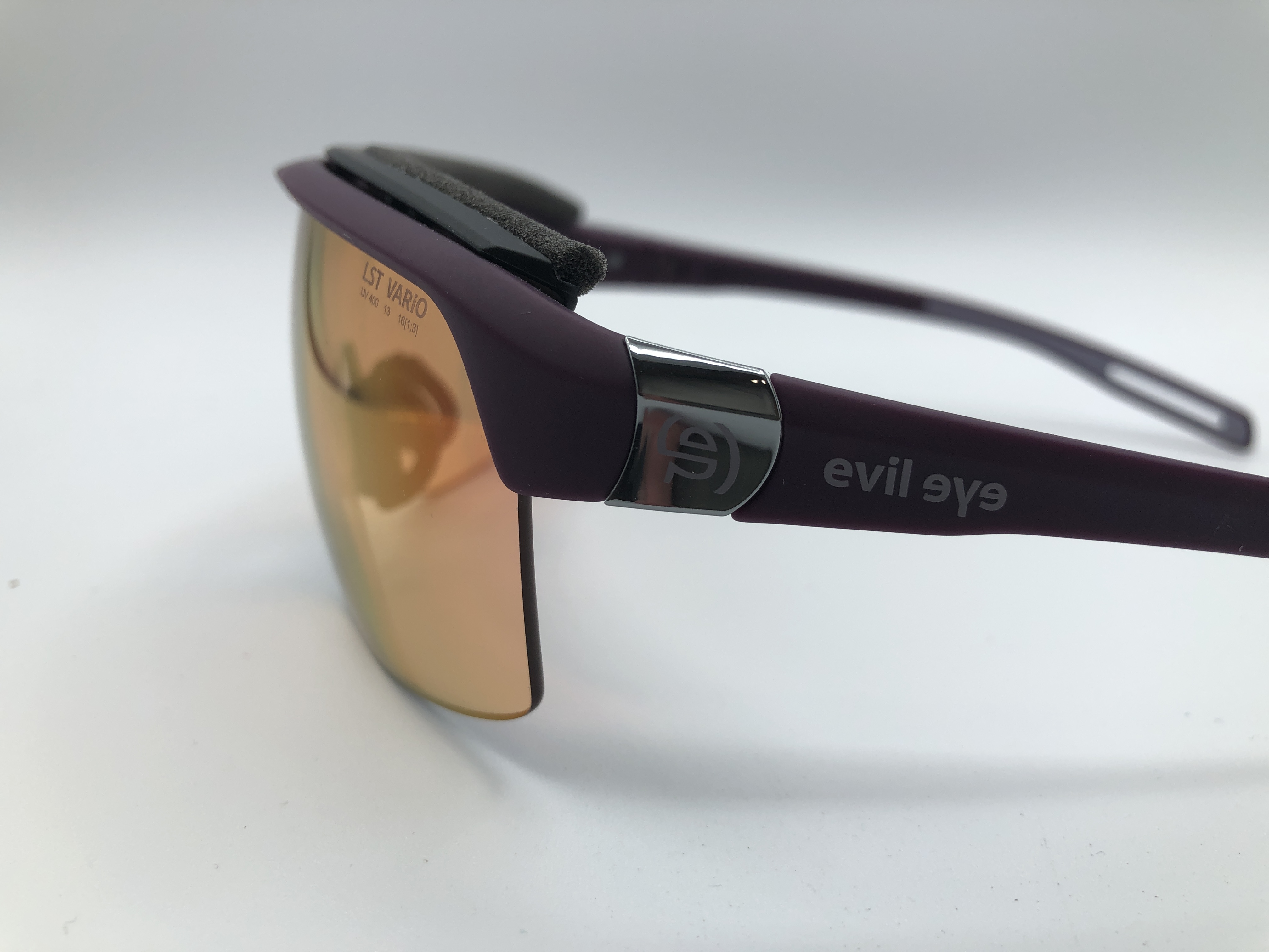 Sportbrille von evil eye in mattlila mit Kontraststeigernden, selbsttönenden Brillengläsern und einer Orange- Pinken Verspiegelung (LST® VARiO purple M). Modellgröße: S